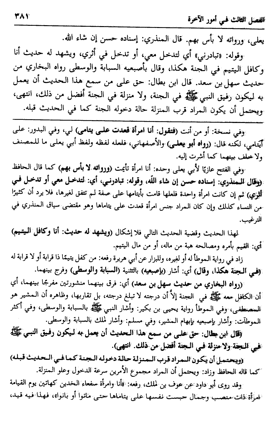 وفي الفتح عازيًا لأبي يعلى وحده: أنا امرأة تأيمت, "ورواته لا بأس بهم" كما قال الحافظ, "وقال المنذري: إسناده حسن إن شاء الله، وقوله: "تبادرني"، أي: لتدخل معي أو تدخل في أثري، ثم إن كانت امرأة واحدة فلعلّها قامت بأيتامها على صفة لم تتفق لغيرها، فلا يرد أن كثيرًا من النساء كذلك, وإن كان المراد جنس امرأة قعدت على يتاماها وهو مقتضى سياق المنذري في الترغيب لهذا الحديث, وقضية الحديث التالي فلا إشكال, "ويشهد له حديث: "أنا وكافل اليتيم" أي: القيم بأمره ومصالحه هبة من ماله، أو من مال اليتيم.