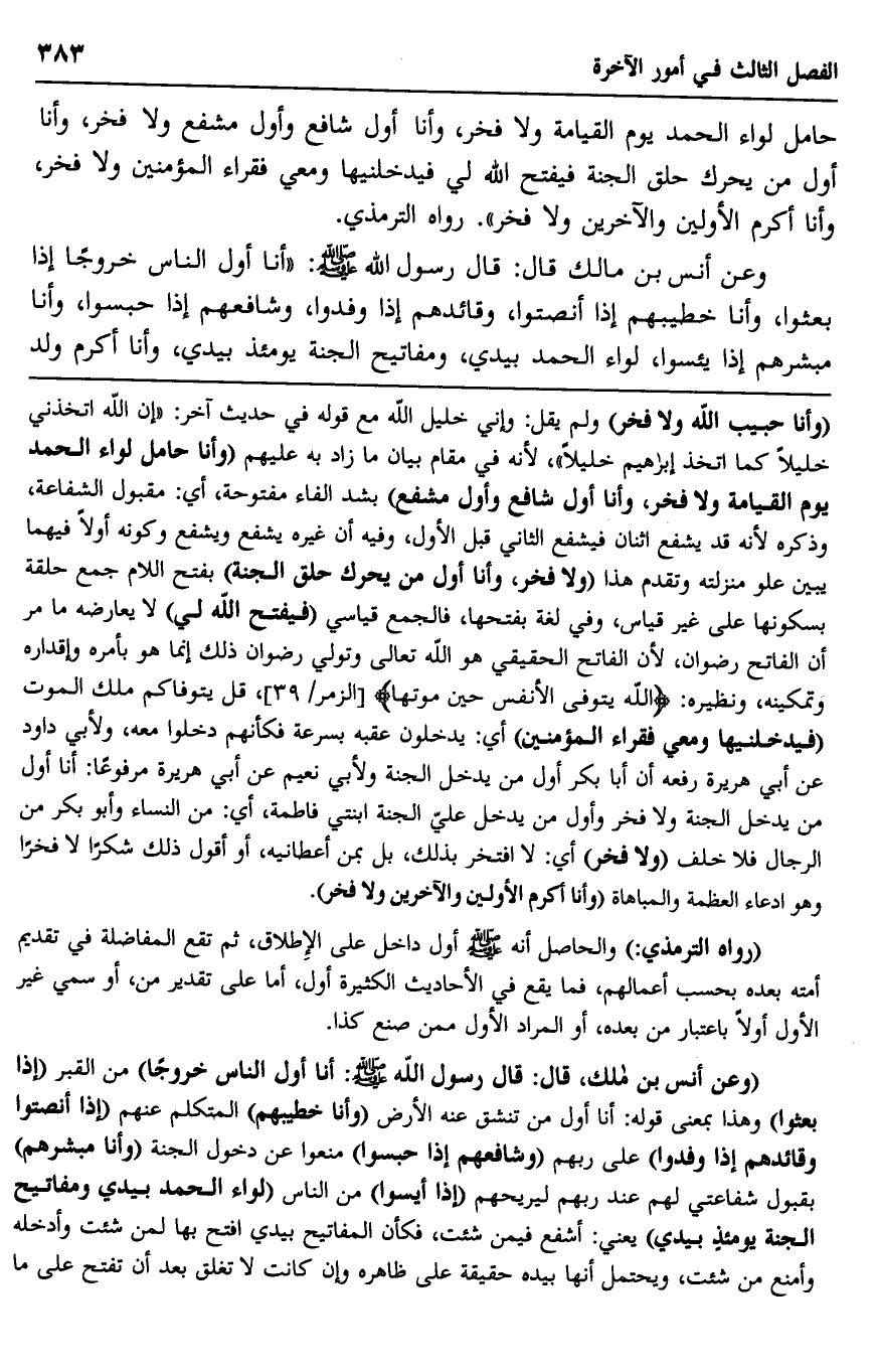 حامل لواء الحمد يوم القيامة ولا فخر، وأنا أوّل شافع وأوّل مشفَّع ولا فخر، وأنا أول من يحرك حلق الجنة فيفتح الله لي, فيدخلنيها ومعي فقراء المؤمنين ولا فخر، وأنا أكرم الأولين والآخرين ولا فخر" رواه الترمذي.