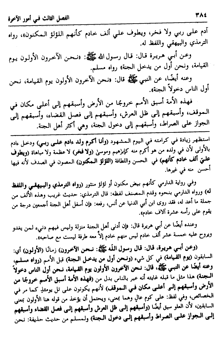 "وعن أبي هريرة، قال: قال رسول الله -صلى الله عليه وسلم: "نحن الآخرون" زمانًا "الأولون" أي: السابقون "يوم القيامة" في كل شيء, "ونحن أوّل من يدخل الجنة" قبل الأمم "رواه مسلم، وعنه أيضًا عن النبي -صلى الله عليه وسلم- قال: "نحن الآخرون الأوّلون يوم القيامة، نحن أوّل الناس دخولًا الجنة" هذا مثل ما قبله, غايته أنه عبَّر بالناس بدل من "فهذه الأمة أسبق الأمم خروجًا من الأرض وأسبقهم إلى أعلى مكان في الموقف"؛ لأنهم يكونون على تل يومئذ كما مَرَّ في الخصائص، وفي لفظ: على كوم عالٍ وهما بمعنى، ويحتمل أن يؤخذ من قول هنا الأولون بمعنى السابقين؛ لأن العلوَّ سبق أيضًا "وأسبقهم إلى ظلّ العرش, وأسبقهم إلى فصل القضاء, وأسبقهم إلى الجواز على الصراط, وأسبقهم إلى دخول الجنة" ولمسلم من حديث حذيفة: "نحن