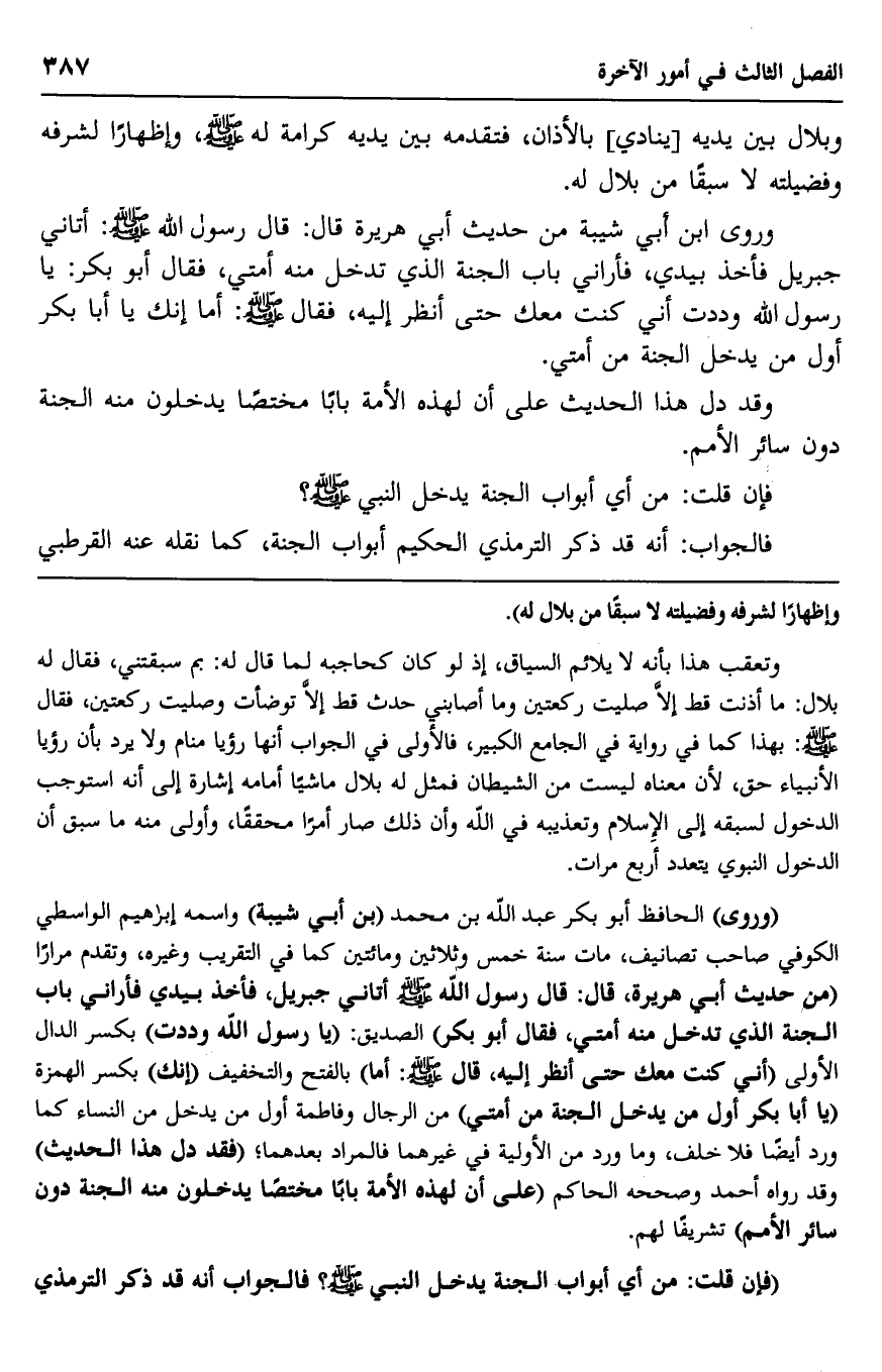 "فإن قلت: من أي أبواب الجنة يدخل النبي -صلى الله عليه وسلم؟ فالجواب: إنه قد ذكر الترمذي