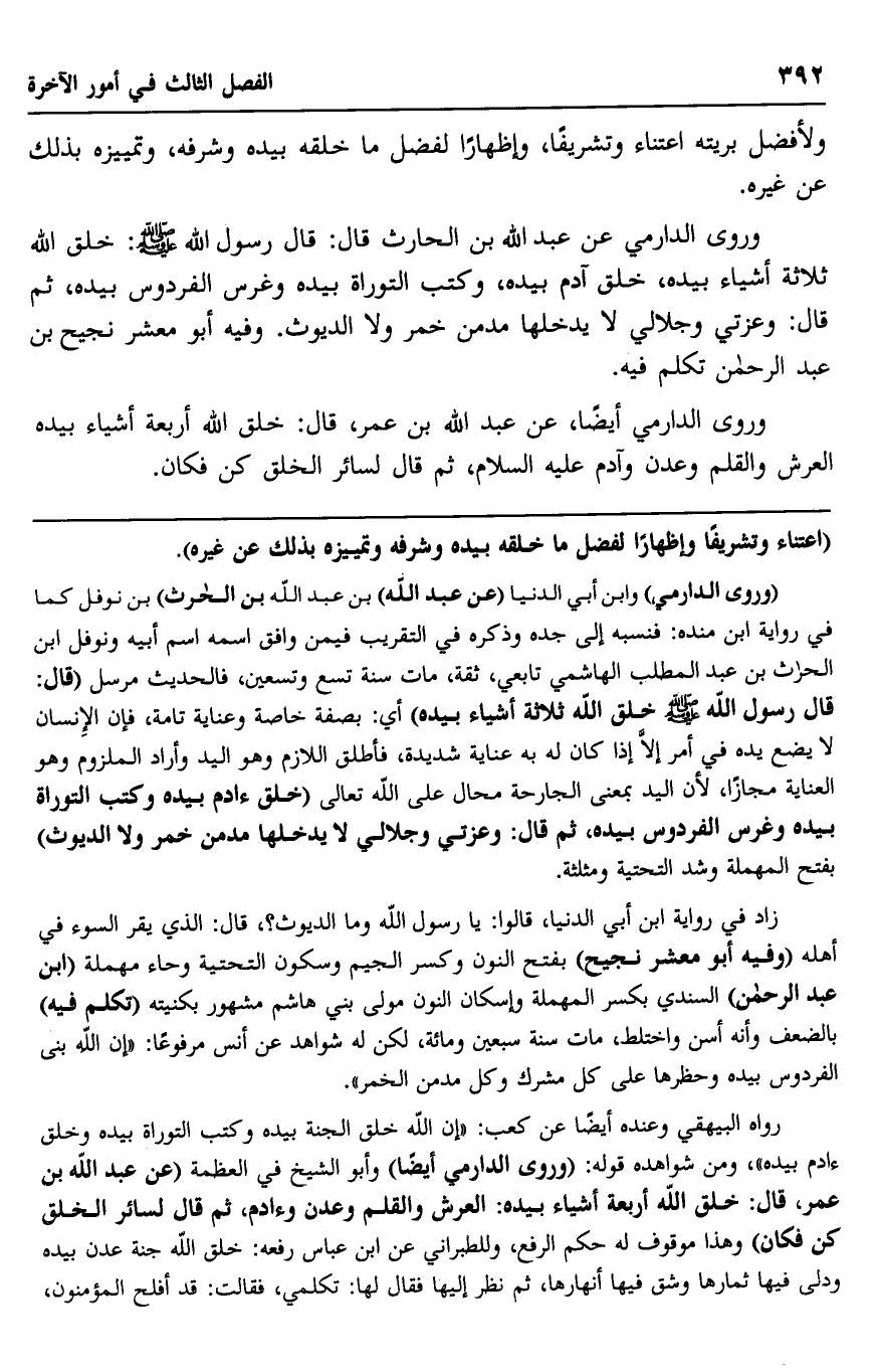 وروى الدارمي عن عبد الله بن الحارث قال: قال رسول الله -صلى الله عليه وسلم: "خلق الله ثلاثة أشياء بيده، خلق آدم بيده، وكتب التوراة بيده, وغرس الفردوس بيده، ثم قال: وعزَّتي وجلالي, لا يدخلها مدمن خمر ولا الديوث" وفيه أبو معشر نجيح بن عبد الرحمن تُكُلِّمَ فيه.