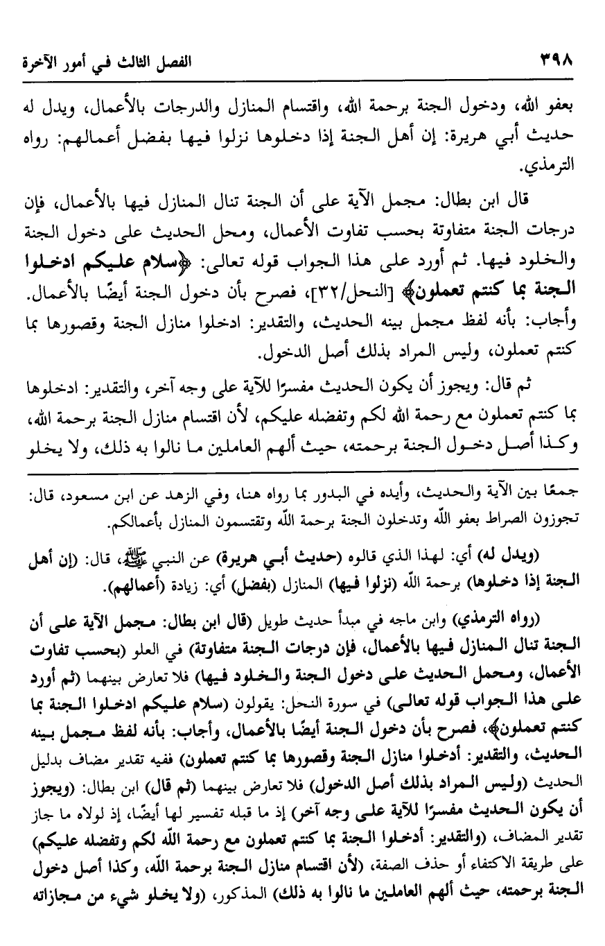 قال ابن بطال: مجمل الآية على أنَّ الجنة تنال المنازل فيها بالأعمال، فإن درجات الجنة متفاوتة بحسب تفاوت الأعمال، ومحل الحديث على دخول الجنة والخلود فيها, ثم أورد على هذا الجواب قوله تعالى: {سَلَامٌ عَلَيْكُمُ ادْخُلُوا الْجَنَّةَ بِمَا كُنْتُمْ تَعْمَلُونَ} [النحل: 32] فصرَّح بأن دخول الجنة أيضًا بالأعمال. وأجاب بأنه لفظ مجمل بينه الحديث، والتقدير: ادخلوا منازل الجنة وقصورها بما كنتم تعملون، وليس المراد بذلك أصل الدخول.