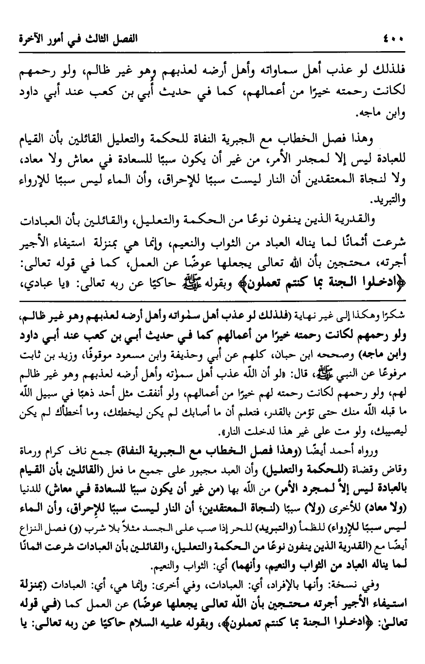 ورواه أحمد أيضًا "وهذا فصل الخطاب مع الجبرية النفاة" جمع نافٍ كرام ورماة وقاض وقضاة, "للحكمة والتعليل" وأنَّ العبد المجبور على جميع ما فعل القائلين بأنَّ القيام بالعبادة ليس إلّا لمجرد الأمر" من الله بها من غير أن يكون سببًا للسعادة في معاش" للدنيا, "ولا معاد" للأخرى, "ولا" سببًا "لنجاة المعتقدين" أنَّ النار ليست سببًا للإحراق، وأنَّ الماء ليس سببًا للإرواء" للظمأ "والتبريد" للحر إذا صب على الجسد مثلا بلا شرب "و" فصل النزاع أيضًا "مع القدرية الذين ينفون نوعًا من الحكمة والتعليل, والقائلين بأن العبادات شرعت اثمانًا لما يناله العباد من الثواب والنعيم، وأنهما" أي: الثواب والنعيم.
