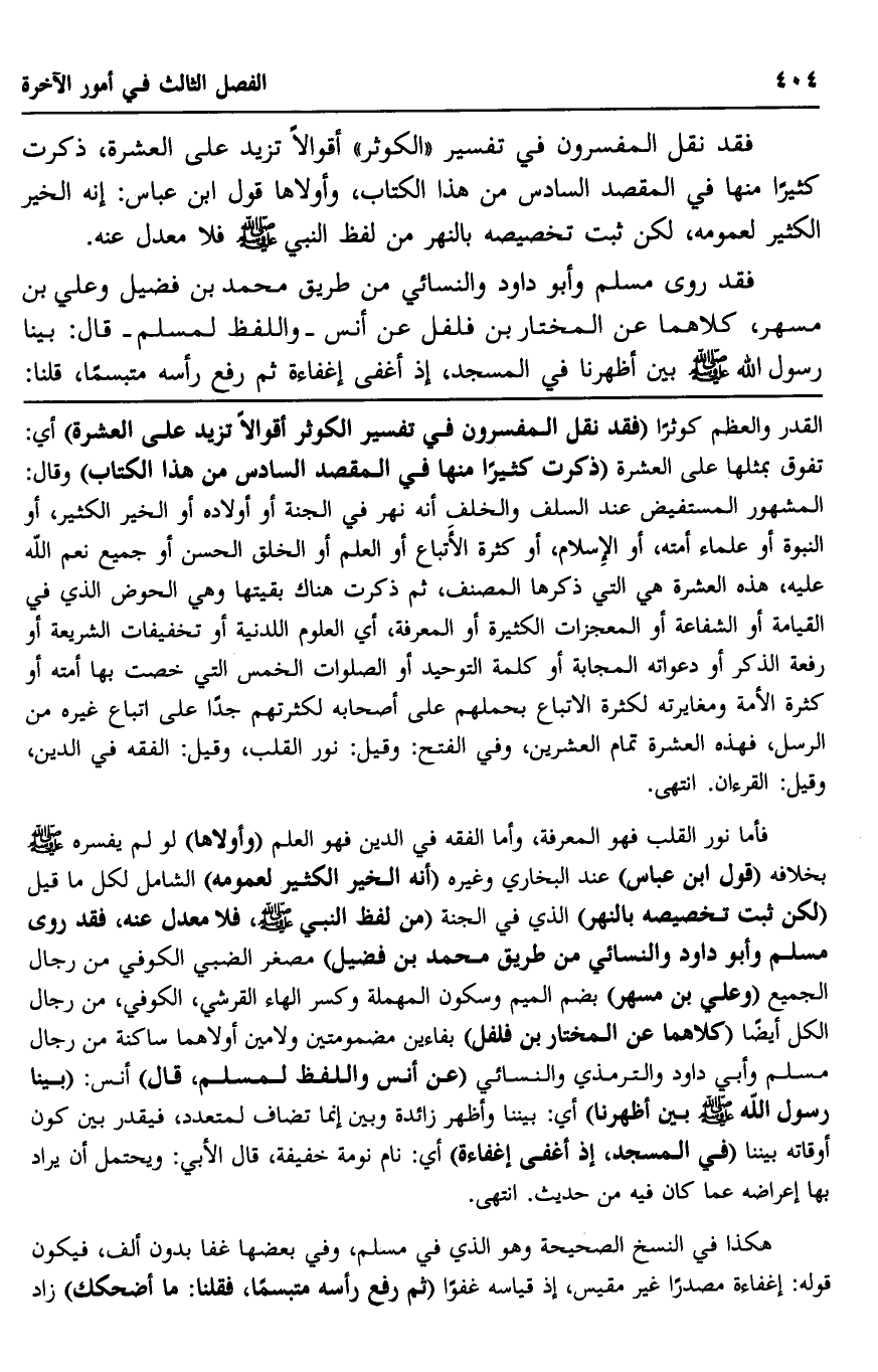 فأمَّا نور القلب فهو المعرفة، وأمَّا الفقه في الدين فهو العلم, "وأولادها" لو لم يفسره -صلى الله عليه وسلم- بخلاف قول ابن عباس" عند البخاري وغيره "أنه الخير الكثير لعمومه الشامل" لكل ما قيل, لكن ثبت تخصيصه بالنهر " الذي في الجنة من لفظ النبي -صلى الله عليه وسلم, فلا معدل عنه فقد روى مسلم وأبو داود والنسائي من طريق محمد بن فضيل" مصغَّر- الضبي الكوفي, من رجال الجميع, وعليّ بن مسهر" بضم الميم وسكون المهملة وكسر الهاء- القرشي، الكوفي، من رجال الكل أيضًا "كلاهما عن المختار بن فلفل" بفاءين مضمومتين ولامين أولاهما ساكنة, من رجال مسلم وأبي داود والترمذي والنسائي, "عن أنس واللفظ لمسلم، قال" أنس: "بينا رسول الله -صلى الله عليه وسلم- بين أظهرنا" أي: بيننا, وأظهر زائدة, وبين إنما تضاف لمتعدد، فيقدر بين كون أوقاته بيننا "في المسجد؛ إذ أغفى إغفاءة" أي: نام نومة خفيفة، قال الأبي: ويحتمل أن يراد بها إعراضه عمَّا كان فيه من حديث. انتهى.