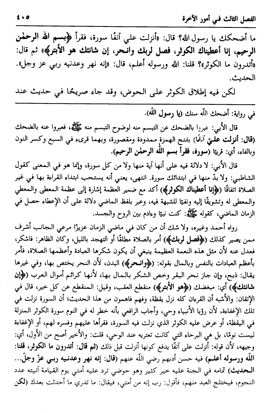 {إِنَّا أَعْطَيْنَاكَ الْكَوْثَرَ، فَصَلِّ لِرَبِّكَ وَانْحَرْ، إِنَّ شَانِئَكَ هُوَ الْأَبْتَرُ} ثم قال: "أتدرون ما الكوثر" , قلنا: الله ورسوله أعلم، قال: "إنه نهر وعدنيه ربي -عز وجل". الحديث.
