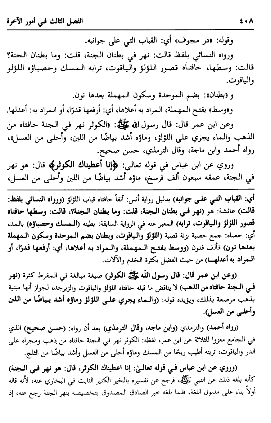 "وعن ابن عمر قال: قال رسول الله -صلى الله عليه وسلم: "الكوثر" صيغة مبالغة في المفرط كثرة, "نهر في الجنة, حافَّتاه من الذهب" لا يناقض ما قبله: حافتاه اللؤلؤ والياقوت والزبرجد، لجواز أنها مبنية بذهب مرصعة بذلك، ويؤيده قوله: "والماء يجري على اللؤلؤ, وماؤه أشد بياضًا من اللبن, وأحلى من العسل".