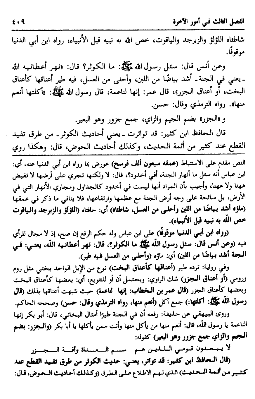 وعن أنس قال: سئل رسول الله -صلى الله عليه وسلم: ما الكوثر؟ قال: "نهر أعطانيه الله" -يعني: في الجنة- "أشد بياضًا من اللبن، وأحلى من العسل، فيه طير أعناقها كأعناق البخت، أو أعناق الجزر"، قال عمر: إنها لناعمة، قال رسول الله -صلى الله عليه وسلم: "أكلتها أنعم منها". رواه الترمذي, وقال: حسن.