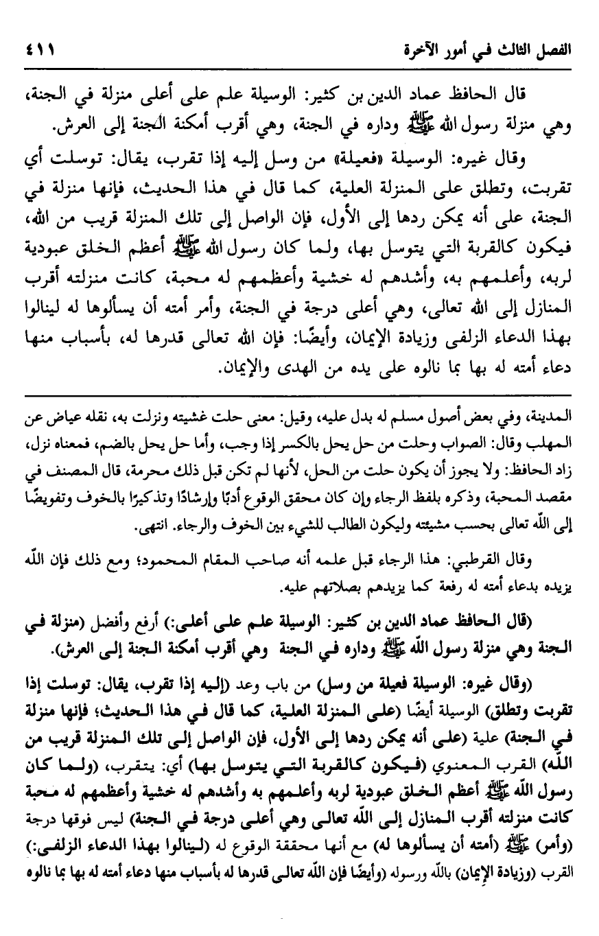 "قال الحافظ عماد الدين بن كثير: الوسيلة عَلَمٌ على أعلى" أرفع وأفضل "منزلة في الجنة, وهي منزلة رسول الله -صلى الله عليه وسلم, وداره في الجنة, وهي أقرب أمكنة الجنة إلى العرش".