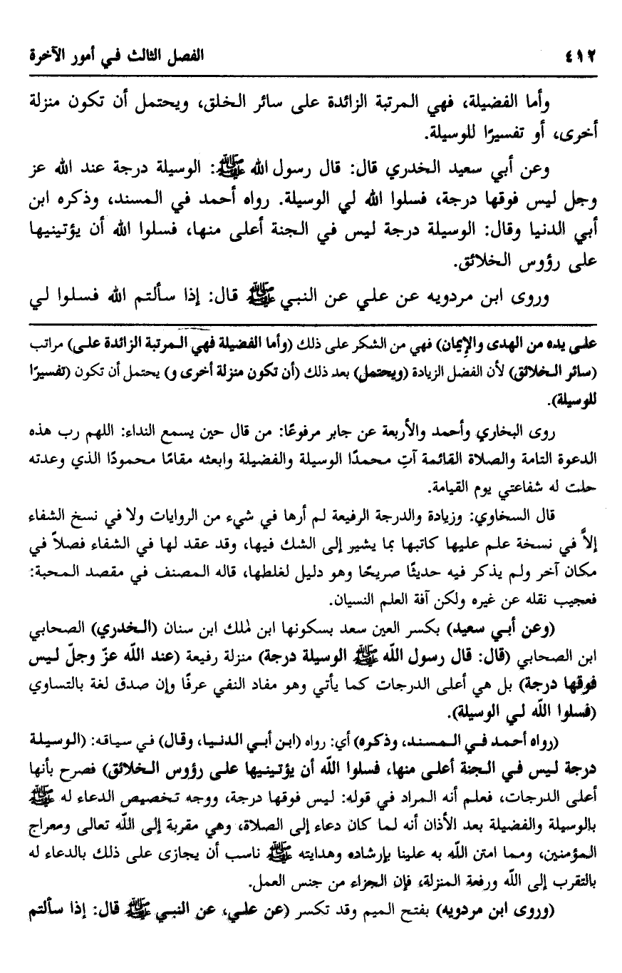 على يده من الهدى والإيمان", فهي من الشكر على ذلك, "وأما الفضيلة فهي المرتبة الزائدة على" مراتب "سائر الخلائق"؛ لأن الفضل الزيادة, "ويحتمل" بعد ذلك "أن تكون منزلة أخرى, "يحتمل أن تكون "تفسيرًا للوسيلة".