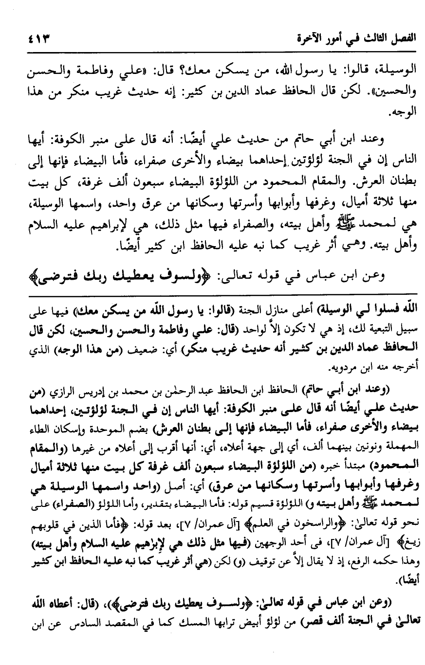 الوسيلة"، قالوا: يا رسول الله، من يسكن معك؟ قال: "علي وفاطمة والحسن والحسين", لكن قال الحافظ عماد الدين بن كثير: إنه حديث غريب منكر من هذا الوجه.