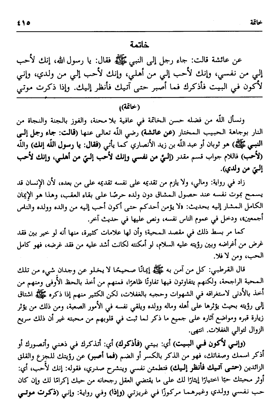 ونسأل الله من فضله حسن الخاتمة في عافية بلا محنة، والفوز بالجنة, والنجاة من النار بوجاهة الحبيب المختار, "عن عائشة" رضي الله عنه تعالى عنها "قالت: جاء رجل إلى النبي -صلى الله عليه وسلم" هو ثوبان أو عبد الله بن زيد الأنصاري، كما يأتي "فقال: يا رسول الله, إنك" والله "لأحب" فاللام جواب قسم مقدَّر "إليَّ من نفسي, وإنك لأحب إليَّ من أهلي, وإنك لأحب إليَّ من ولدي".