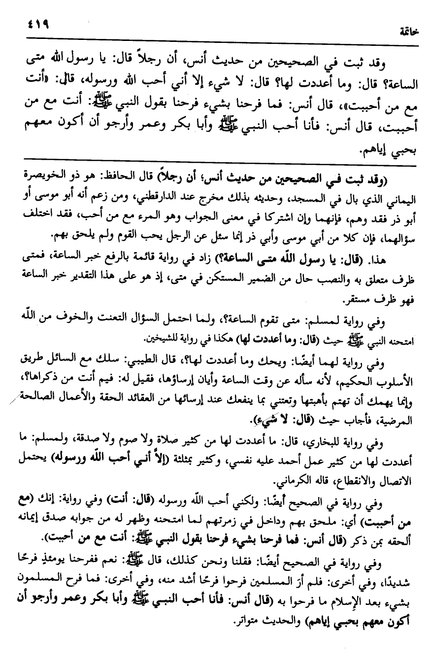 وفي رواية في الصحيح أيضًا: فقلنا: ونحن كذلك، قال -صلى الله عليه وسلم: "نعم" ففرحنا يومئذ فرحًا شديدًا، وفي أخرى. فلم أر المسلمين فرحوا فرحًا أشد منه، وفي أخرى: فما فرح المسلمون بشيء بعد الإسلام ما فرحوا به, "قال أنس: فأنا أحب النبي -صلى الله عليه وسلم- وأبا بكر وعمر, وأرجو أن أكون معهم بحبي إياهم" والحديث متواتر.