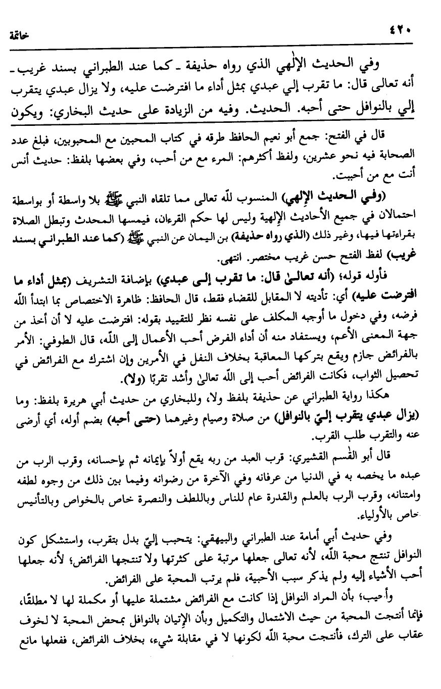 وفي الحديث الإلهي الذي رواه حذيفة -كما عند الطبراني بسند غريب- أنه تعالى قال: "ما تقرَّب إليَّ عبدي بمثل أداء ما افترضت عليه، ولا يزال عبدي يتقرَّب إليَّ بالنوافل حتى أحبه" الحديث. وفيه من الزيادة على حديث البخاري: ويكون