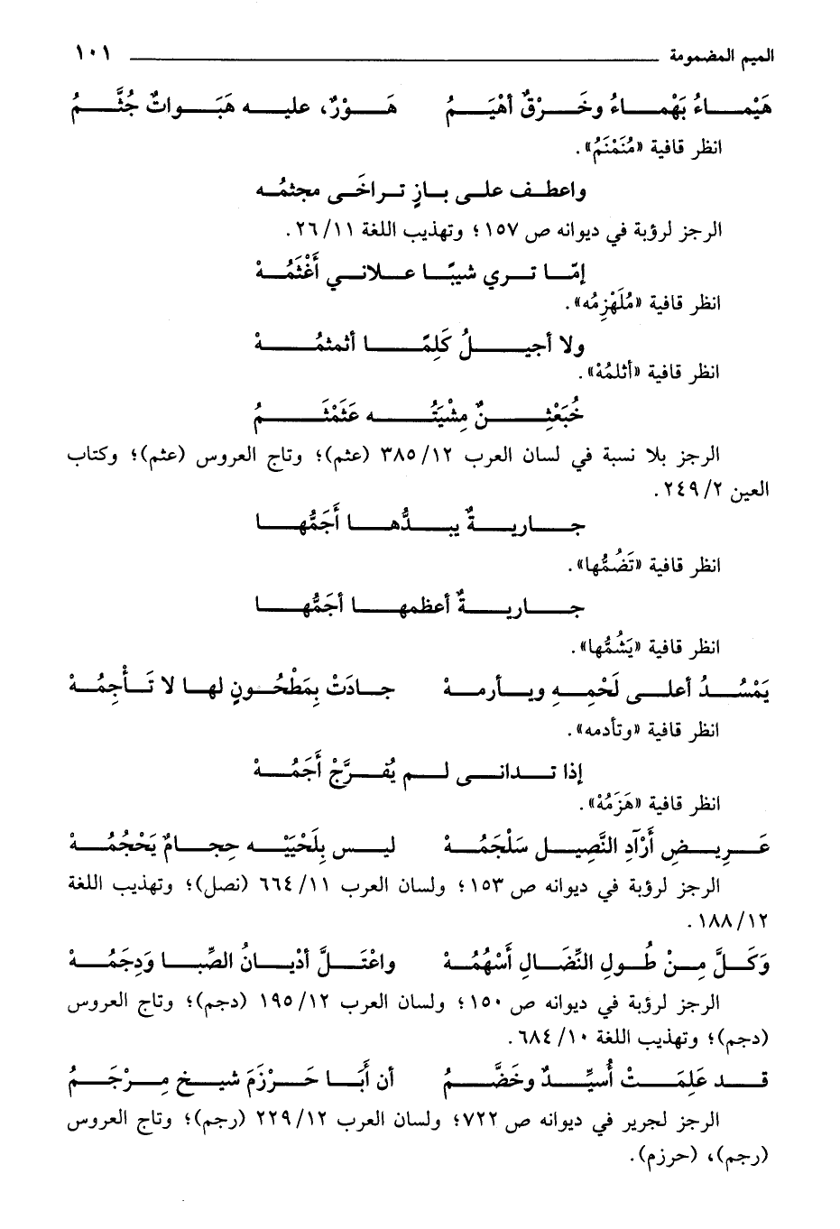 الرجز لجرير في ديوانه ص 772؛ ولسان العرب 12/ 229 (رجم)؛ وتاج العروس (رجم)، (حرزم).