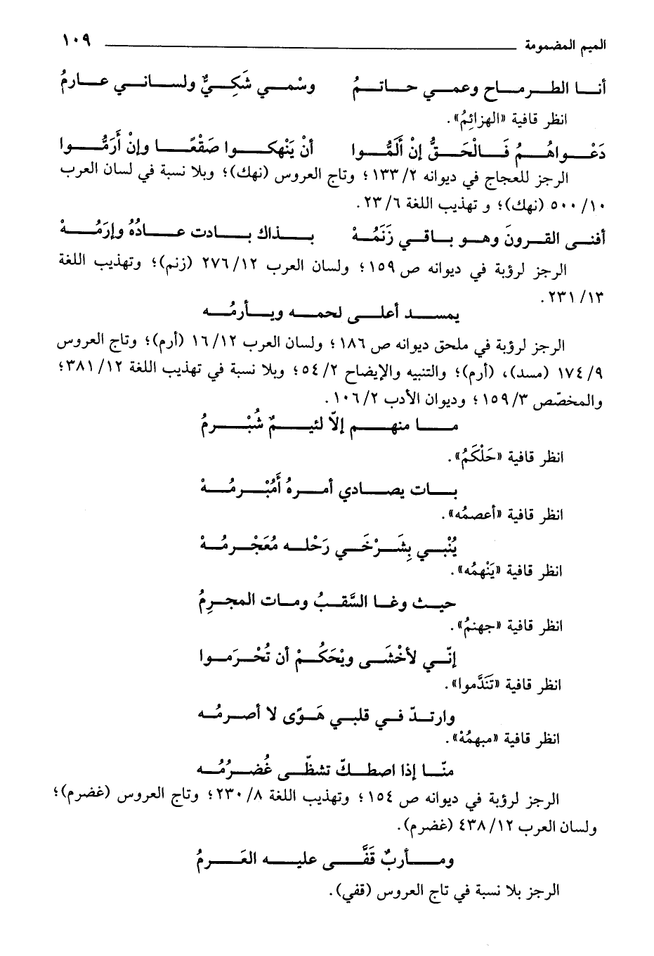 الرجز لرؤبة في ملحق ديوانه ص 186؛ ولسان العرب 12/ 16 (أرم)؛ وتاج العروس 9/ 174 (مسد)، (أرم)؛ والتنبيه والإيضاح 2/ 54؛ وبلا نسبة في تهذيب اللغة 12/ 381؛ والمخصّص 3/ 159؛ وديوان الأدب 2/ 106.
