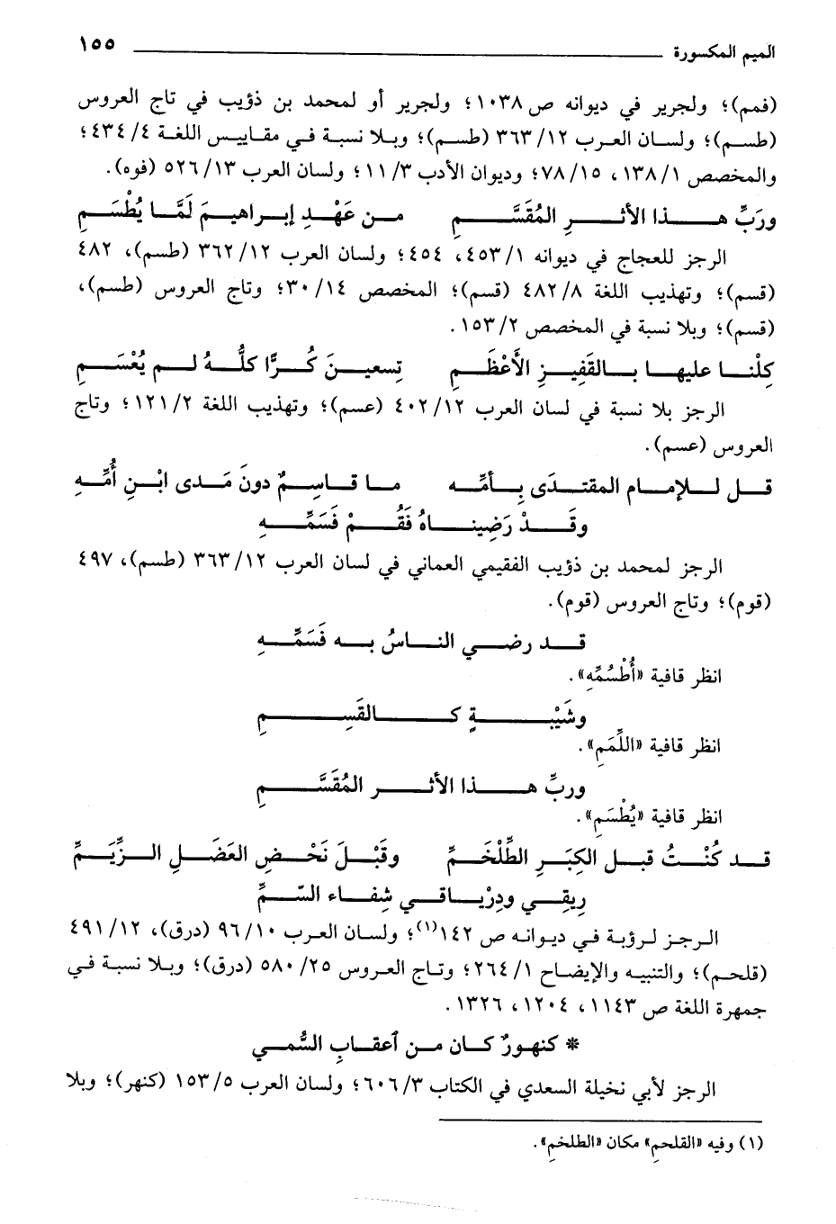 الرجز للعجاج في ديوانه 1/ 453، 454؛ ولسان العرب 12/ 362 (طسم)، 482 (قسم)؛ وتهذيب اللغة 8/ 482 (قسم)؛ المخصص 14/ 30؛ وتاج العروس (طسم)، (قسم)؛ وبلا نسبة في المخصص 2/ 153.