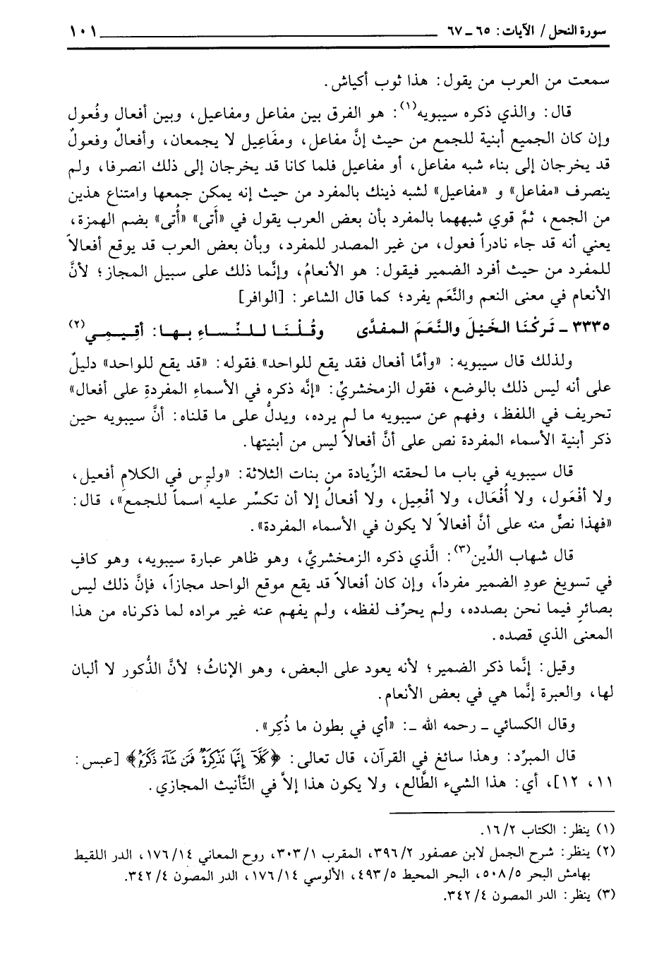 قال شهاب الدِّين: الَّذي ذكره الزمخشريَّ، وهو ظاهر عبارة سيبويه، وهو كافٍ في تسويغ عودِ الضمير مفرداً، وإن كان أفعالاً قد يقع موقع الواحد مجازاً، فإنَّ ذلك ليس بصائرٍ فيما نحن بصدده، ولم يحرِّف لفظه، ولم يفهم عنه غير مراده لما ذكرناه من هذا المعنى الذي قصده.