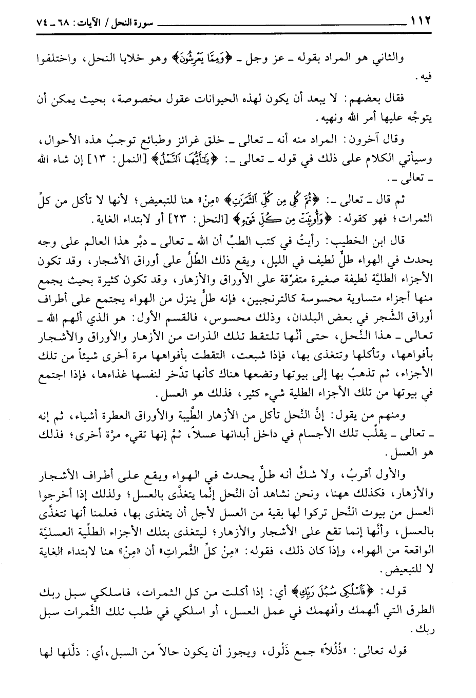 والأول أقربُ، ولا شكَّ أنه طلٌّ يحدث في الهواء ويقع على أطراف الأشجار والأزهار، فكذلك ههنا، ونحن نشاهد أن النَّحل إنَّما يتغذَّى بالعسل؛ ولذلك إذا أخرجوا العسل من بيوت النَّحل تركوا لها بقية من العسل لأجل أن يتغذى بها، فعلمنا أنها تتغذَّى بالعسل، وأنَّها إنما تقع على الأشجار والأزهار؛ ليتغذى بتلك الأجزاء الطلِّية العسليَّة الواقعة من الهواء، وإذا كان ذلك، فقوله: «مِنْ كلِّ الثَّمراتِ» أن «مِنْ» هنا لابتداء الغاية لا للتبعيض.
