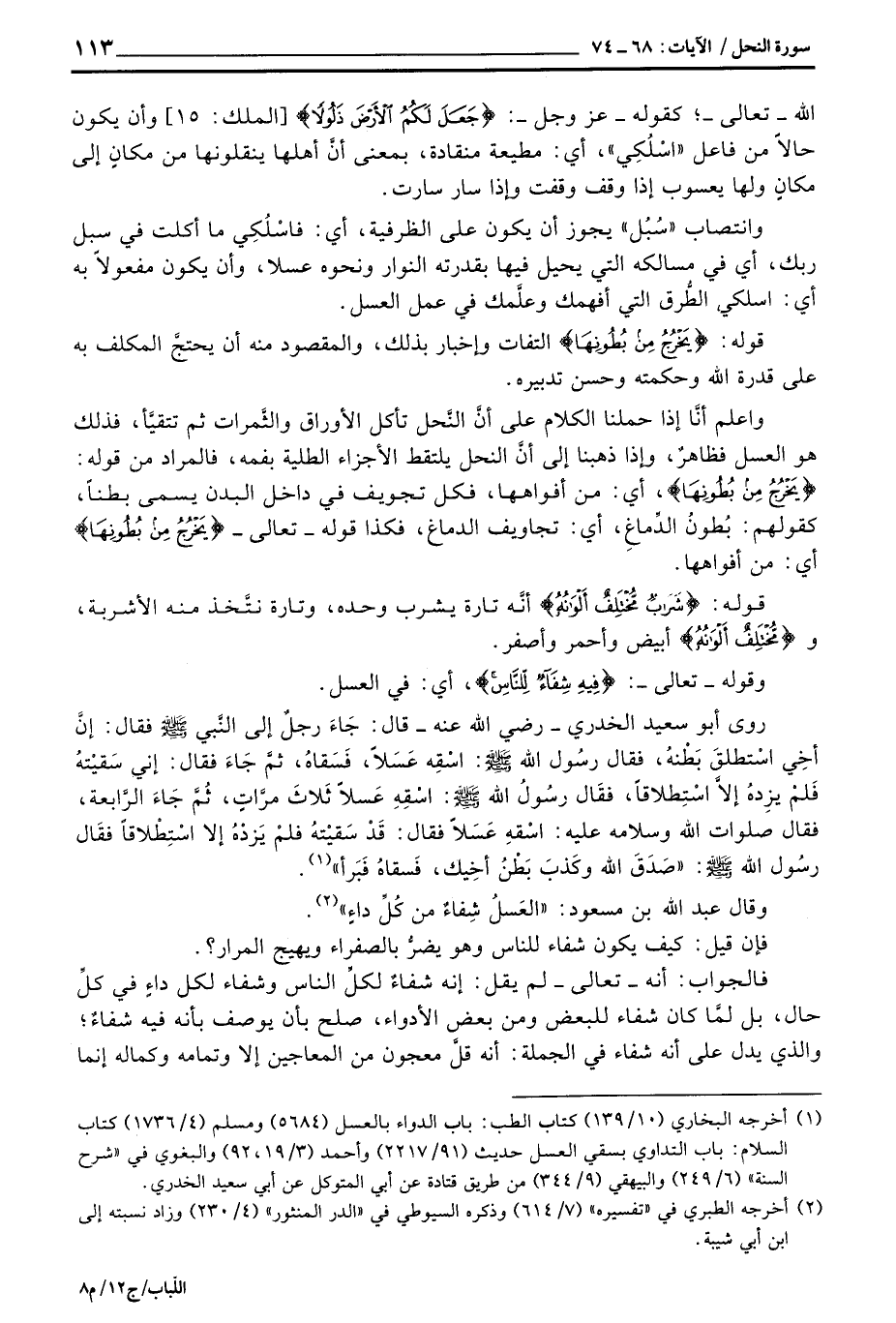 وانتصاب «سُبُل» يجوز أن يكون على الظرفية، أي: فاسْلُكِي ما أكلت في سبل ربك، أي في مسالكه التي يحيل فيها بقدرته النوار ونحوه عسلا، وأن يكون مفعولاً به أي: اسلكي الطُّرق التي أفهمك وعلَّمك في عمل العسل.