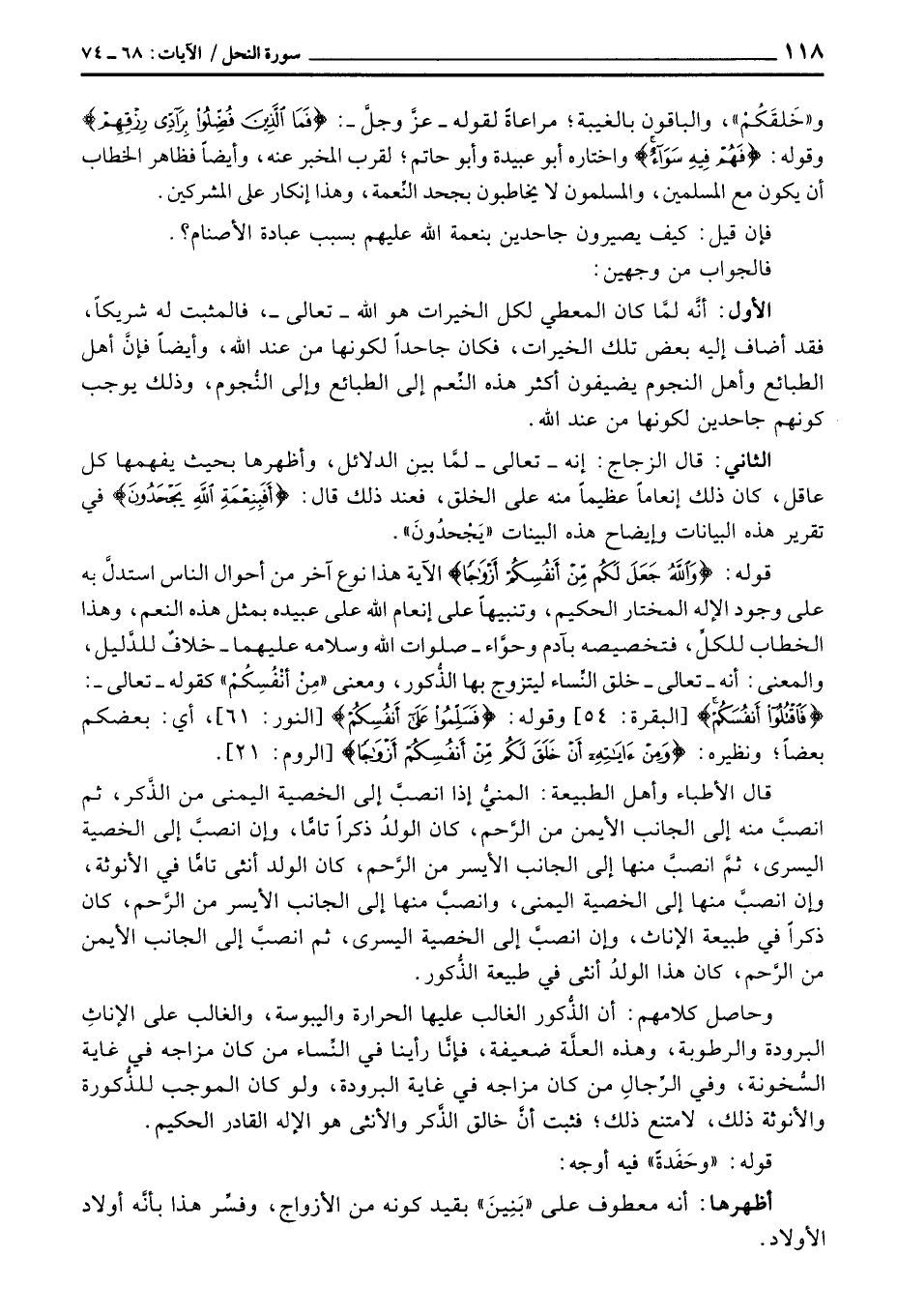 وحاصل كلامهم: أن الذُّكور الغالب عليها الحرارة واليبوسة، والغالب على الإناثِ البرودة والرطوبة، وهذه العلَّة ضعيفة، فإنَّا رأينا في النِّساء من كان مزاجه في غاية السُّخونة، وفي الرِّجالِ من كان مزاجه في غاية البرودة، ولو كان الموجب للذُّكورة والأنوثة ذلك، لامتنع ذلك؛ فثبت أنَّ خالق الذَّكر والأنثى هو الإله القادر الحكيم.