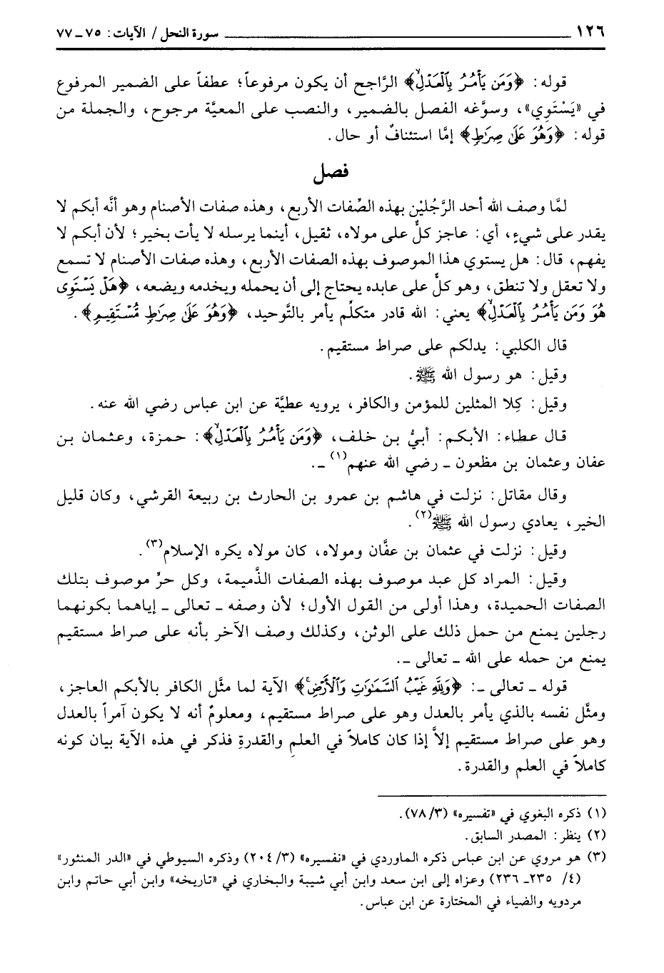 لمَّا وصف الله أحد الرَّجُليْن بهذه الصِّفات الأربع، وهذه صفات الأصنام وهو أنَّه أبكم لا يقدر على شيءٍ، أي: عاجز كلٌّ على مولاه، ثقيل، أينما يرسله لا يأت بخير؛ لأن أبكم لا يفهم، قال: هل يستوي هذا الموصوف بهذه الصفات الأربع، وهذه صفات الأصنام لا تسمع ولا تعقل ولا تنطق، وهو كلٌّ على عابده يحتاج إلى أن يحمله ويخدمه ويضعه، {هَلْ يَسْتَوِي هُوَ وَمَن يَأْمُرُ بالعدل} يعني: الله قادر متكلِّم يأمر بالتَّوحيد، {وَهُوَ على صِرَاطٍ مُّسْتَقِيمٍ} .