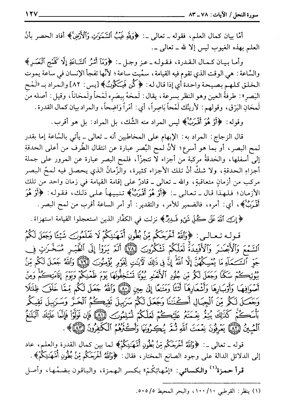 وأما بيان كمال القدرة، فقوله - عَزَّ وَجَلَّ -: {وَمَآ أَمْرُ الساعة إِلاَّ كَلَمْحِ البصر} والسَّاعة: هي الوقت الذي تقوم فيه القيامة، سمِّيت ساعة؛ لأنَّها تفجأ الإنسان في ساعة يموت الخلق كلهم بصيحة واحدة أي إذا قال له: {كُنْ فَيَكُونُ} [يس: 82] والمراد ب «لَمْحِ البَصرِ» : طرفةُ العين وهو النظر بسرعة، يقال: لَمحَهُ بِبصَرِه لَمْحاً ولَمحَاناً، وقيل: أصله من لَمحَانِ البَرْق، وقولهم: لأرينَّك لَمْحاً بَاصِراً، أي: أمْراً وَاضِحاً، والمراد بيان كمال القدرة.