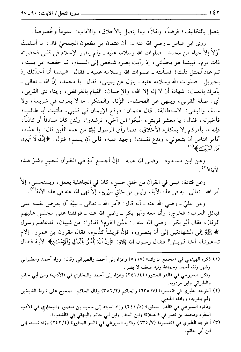 روى ابن عباس - رَضِيَ اللَّهُ عَنْه -: أن عثمان بن مظعون الجمحيَّ قال: ما أسلمتُ أولاً إلاَّ حياء من محمد - صلوات الله وسلامه عليه - ولم يتقرر الإسلام في قلبي فحضرته ذات يوم، فبينما هو يحدِّثني، إذ رأيت بصره شخص إلى السماءِ، ثم خفضه عن يمينه، ثم عاد لمثل ذلك؛ فسألته - صلوات الله وسلامه عليه - فقال: «بينما أنا أحدِّثك إذ بجبريل - صلوات الله وسلامه عليه - ينل عن يميني، فقال: يا محمد، إنَّ الله - تعالى - يأمرك بالعدل: شهادة أن لا إله إلا الله، والإحسان: القيام بالفرائض، وإيتاء ذي القربى، أي: صلة القربى، وينهى عن الفحشاء: الزِّنا، والمنكرِ: ما لا يعرف في شريعة، ولا سنة، والبغي: الاستطالة» . قال عثمان: فوقع الإيمان في قلبي، فأتيت أبا طالب؛ فأخبرته، فقال: يا معشر قريش، أتَّبعُوا ابن أخي؛ ترشدوا، ولئن كان صادقاً أو كاذباً، فإنه ما يأمركم إلا بمكارم الأخلاق، فلما رأى الرسول صَلَّى اللَّهُ عَلَيْهِ وَسَلَّم َ من عمه اللِّين قال: يا عمَّاه، أتأمر الناس أن يتَّبعوني، وتدع نفسك! وجهد عليه؛ فأبى أن يسلم؛ فنزل: {إِنَّكَ لاَ تَهْدِي مَنْ أَحْبَبْتَ} [القصص: 56] .