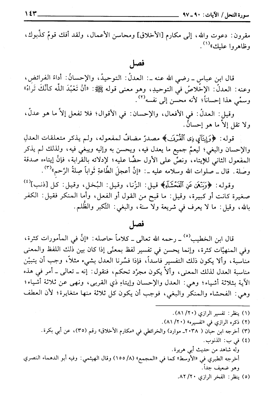 قال ابن الخطيب - رَحِمَهُ اللَّهُ تعالى - كلاماً حاصله: «إنَّ في المأمورات كثرة، وفي المنهيَّات كثرة، وإنتما يحسن في تفسير لفظ بمعنًى إذا كان بين ذلك اللفظ والمعنى مناسبة، وألا يكون ذلك التفسير فاسداً، فإذا فسَّرنا العدل بشيء مثلاً، وجب أن يتبيَّن مناسبة العدل لذلك المعنى، وألاَّ يكون مجرَّد تحكم، فنقول: إنه - تعالى - أمر في هذه الآية بثلاثة أشياء؛ وهي: العدل والإحسان وإيتاءِ ذي القربى، ونهى عن ثلاثة أشياء؛ وهي: الفحشاء والمنكر والبغي، فوجب أن يكون كل ثلاثة منها متغايرة؛ لأن العطف