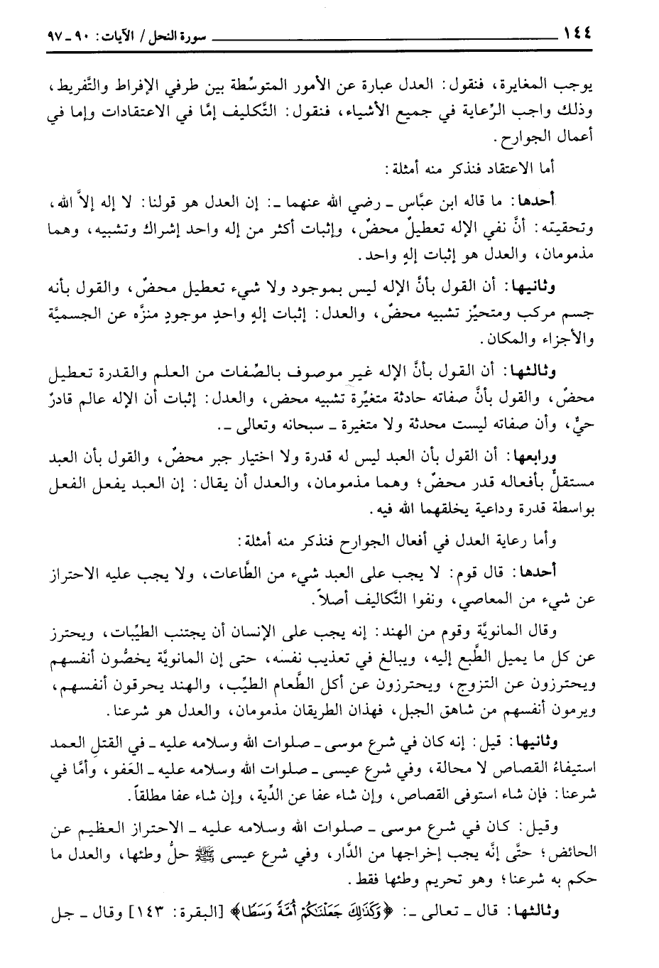 وثالثها: أن القول بأنَّ الإله غير موصوف بالصِّفات من العلم والقدرة تعطيل محضٌ، والقول بأنَّ صفاته حادثة متغيِّرة تشبيه محض، العدل: إثبات أن الإله عالم قادرٌ حيٌّ، وأن صفاته ليست محدثة ولا متغيرة - سبحانه وتعالى -.
