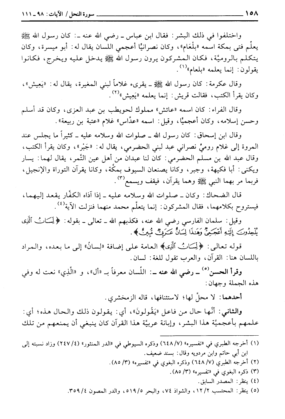 واختلفوا في ذلك البشر: فقال ابن عباس - رَضِيَ اللَّهُ عَنْه -: كان رسول الله صَلَّى اللَّهُ عَلَيْهِ وَسَلَّم َ يعلِّم فتى بمكة اسمه «بلْعَام» ، وكان نصرانيًّا أعجمي اللسان يقال له: أبو ميسرة، وكان يتكلم بالروميَّة، فكان المشركون يرون رسول الله صَلَّى اللَّهُ عَلَيْهِ وَسَلَّم َ يدخل عليه ويخرج، فكانوا يقولون: إنما يعلمه «بلعام» .