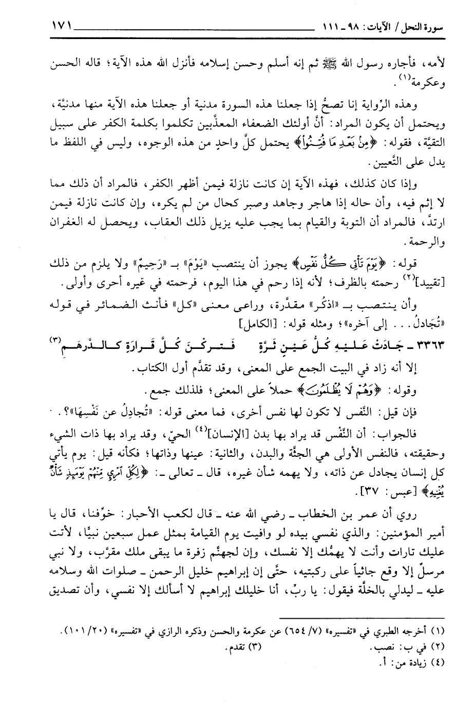 فالجواب: أن النَّفْس قد يراد بها بدن [الإنسان] الحيّ، وقد يراد بها ذات الشيء وحقيقته، فالنفس الأولى هي الجثَّة والبدن، والثانية: عينها وذاتها؛ فكأنه قيل: يوم يأتي كل إنسان يجادل عن ذاته، ولا يهمه شأن غيره، قال - تعالى -: {لِكُلِّ امرىء مِّنْهُمْ يَوْمَئِذٍ شَأْنٌ يُغْنِيهِ} [عبس: 37] .