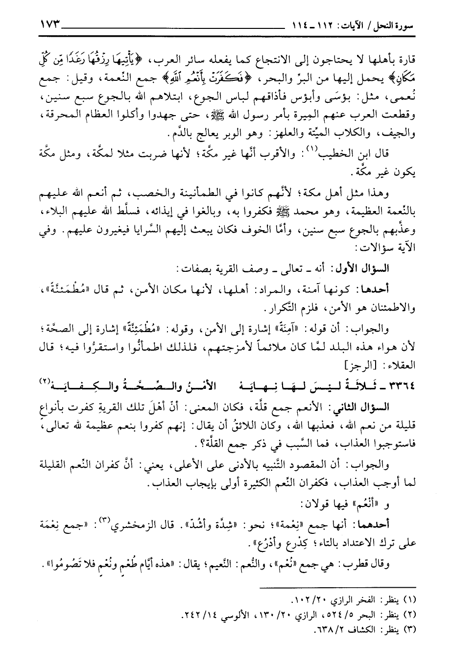 وهذا مثل أهل مكة؛ لأنَّهم كانوا في الطمأنينة والخصب، ثم أنعم الله عليهم بالنِّعمة العظيمة، وهو محمد صَلَّى اللَّهُ عَلَيْهِ وَسَلَّم َ فكفروا به، وبالغوا في إيذائه، فسلَّط الله عليهم البلاء، وعذَّبهم بالجوع سبع سنين، وأمَّا الخوف فكان يبعث إليهم السَّرايا فيغيرون عليهم. وفي الآية سؤالات: