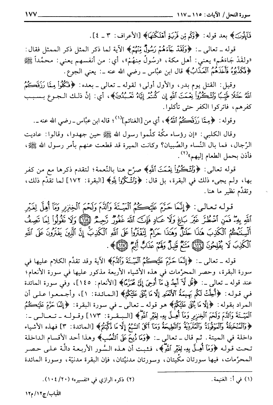 قوله - تعالى -: {إِنَّمَا حَرَّمَ عَلَيْكُمُ الميتة والدم} الآية وقد تقدَّم الكلام عليها في سورة البقرة، وحصر المحرَّمات في هذه الأشياء الأربعة مذكور عليها في سورة الأنعام؛ عند قوله - تعالى -: {قُل لاَّ أَجِدُ فِي مَآ أُوْحِيَ إِلَيَّ مُحَرَّماً} [الأنعام: 145] ، وفي سورة المائدة في قوله: {أُحِلَّتْ لَكُمْ بَهِيمَةُ الأنعام إِلاَّ مَا يتلى عَلَيْكُمْ} [المائدة: 1] ، وأجمعوا على أن المراد بقوله: {إِلاَّ مَا يتلى عَلَيْكُمْ} هو قوله - تعالى - في سورة البقرة: {إِنَّمَا حَرَّمَ عَلَيْكُمُ الميتة والدم وَلَحْمَ الخنزير وَمَآ أُهِلَّ بِهِ لِغَيْرِ الله} [البقرة: 173] وقوله - تعالى -: {والمنخنقة والموقوذة والمتردية والنطيحة وَمَآ أَكَلَ السبع إِلاَّ مَا ذَكَّيْتُمْ} [المائدة: 3] فهذه الأشياء داخلة في الميتة. ثم قال - تعالى -: {وَمَا ذُبِحَ عَلَى النصب} [المائدة: 3] وهذا أحد الأقسام الداخلة تحت قوله {وَمَآ أُهِلَّ بِهِ لِغَيْرِ الله} [البقرة: 173] ، فثبت أن هذه السُّور الأربعة دالَّة على حصر المحرَّمات، فيها سورتان مكِّيتان، وسورتان مدنيَّتان، فإن البقرة مدنيّة، وسورة المائدة