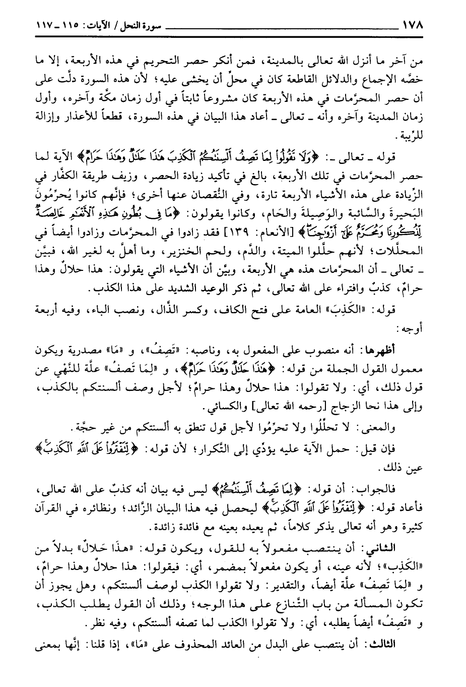 قوله - تعالى -: {وَلاَ تَقُولُواْ لِمَا تَصِفُ أَلْسِنَتُكُمُ الكذب هذا حَلاَلٌ وهذا حَرَامٌ} الآية لما حصر المحرَّمات في تلك الأربعة، بالغ في تأكيد زيادة الحصر، وزيف طريقة الكفَّار في الزِّيادة على هذه الأشياء الأربعة تارة، وفي النُّقصان عنها أخرى؛ فإنَّهم كانوا يُحرِّمُونَ البَحيرةَ والسَّائبة والوَصِيلةَ والحَام، وكانوا يقولون: {مَا فِي بُطُونِ هذه الأنعام خَالِصَةٌ لِّذُكُورِنَا وَمُحَرَّمٌ على أَزْوَاجِنَ} [الأنعام: 139] فقد زادوا في المحرَّمات وزادوا أيضاً في المحلَّلات؛ لأنهم حلَّلوا الميتة، والدَّم، ولحم الخنزير، وما أهلَّ به لغير الله، فبيَّن - تعالى - أن المحرَّمات هذه هي الأربعة، وبيَّن أن الأشياء التي يقولون: هذا حلالٌ وهذا حرامٌ، كذبٌ وافتراء على الله تعالى، ثم ذكر الوعيد الشديد على هذا الكذب.
