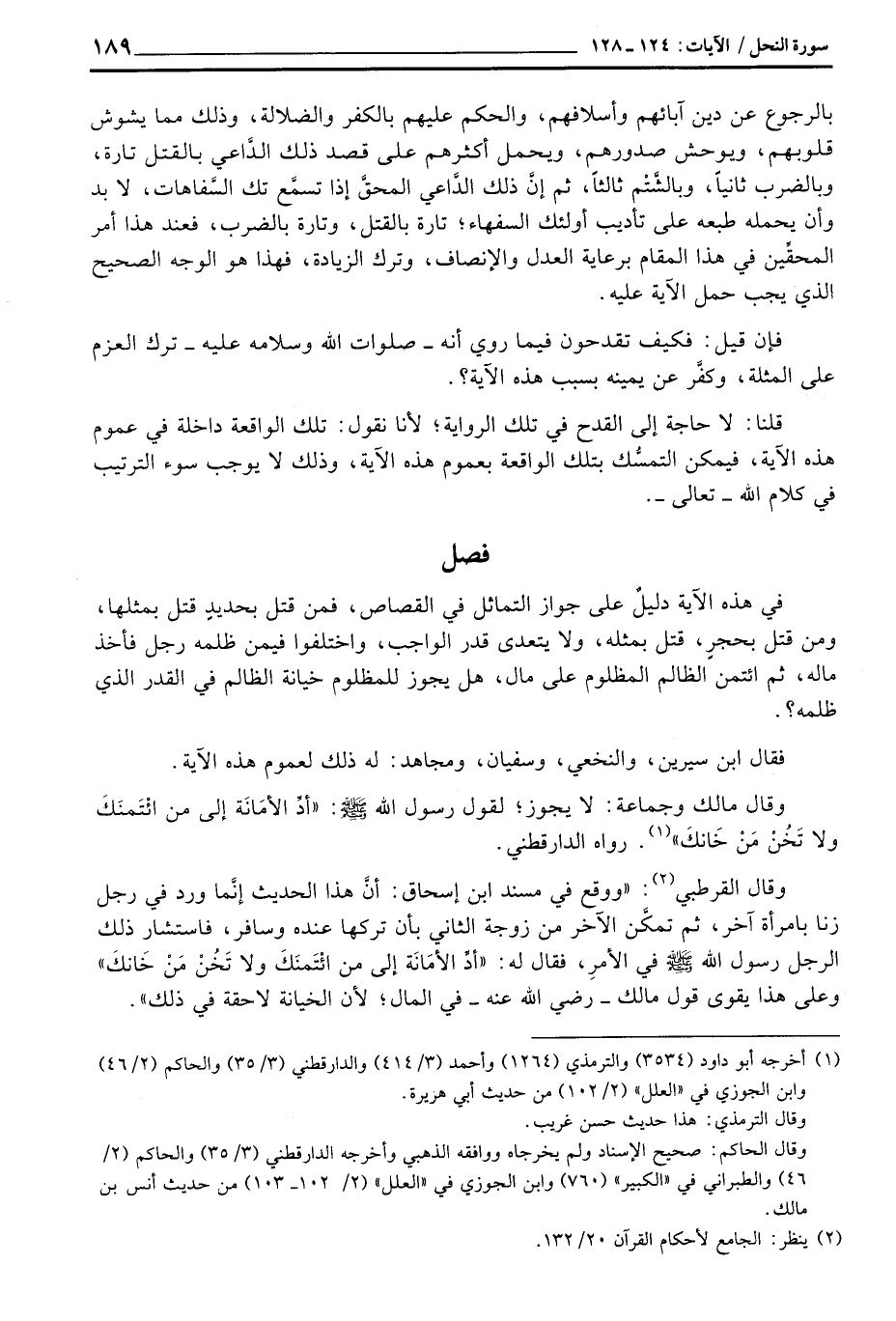 في هذه الآية دليلٌ على جواز التماثل في القصاص، فمن قتل بحديدٍ قتل بمثلها، ومن قتل بحجرٍ، قتل بمثله، ولا يتعدى قدر الواجب، واختلفوا فيمن ظلمه رجل فأخذ ماله، ثم ائتمن الظالم المظلوم على مال، هل يجوز للمظلوم خيانة الظالم في القدر الذي ظلمه؟ .
