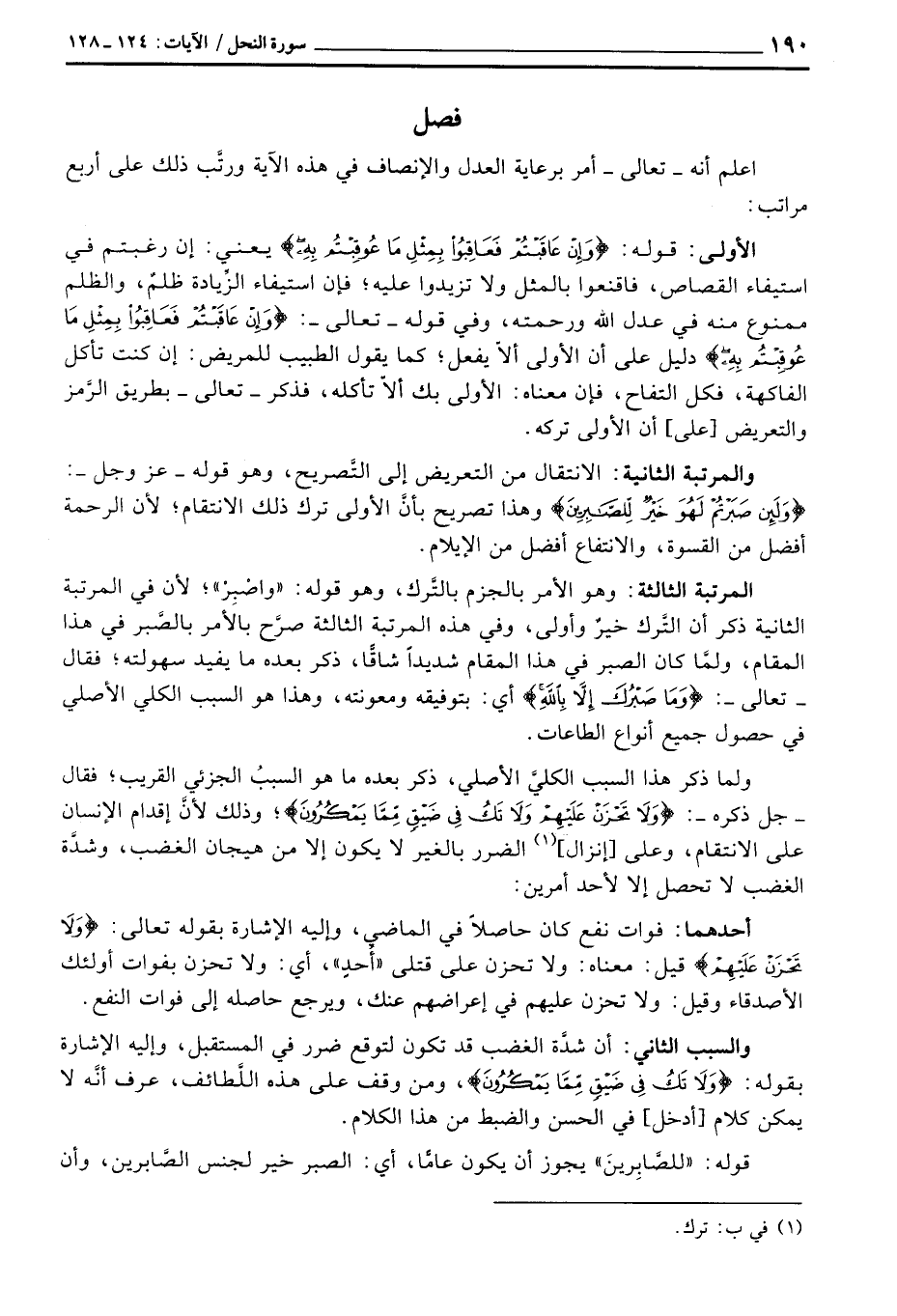 والمرتبة الثانية: الانتقال من التعريض إلى التَّصريح، وهو قوله - عَزَّ وَجَلَّ -: {وَلَئِن صَبَرْتُمْ لَهُوَ خَيْرٌ لِّلصَّابِرينَ} وهذا تصريح بأنَّ الأولى ترك ذلك الانتقام؛ لأن الرحمة أفضل من القسوة، والانتفاع أفضل من الإيلام.