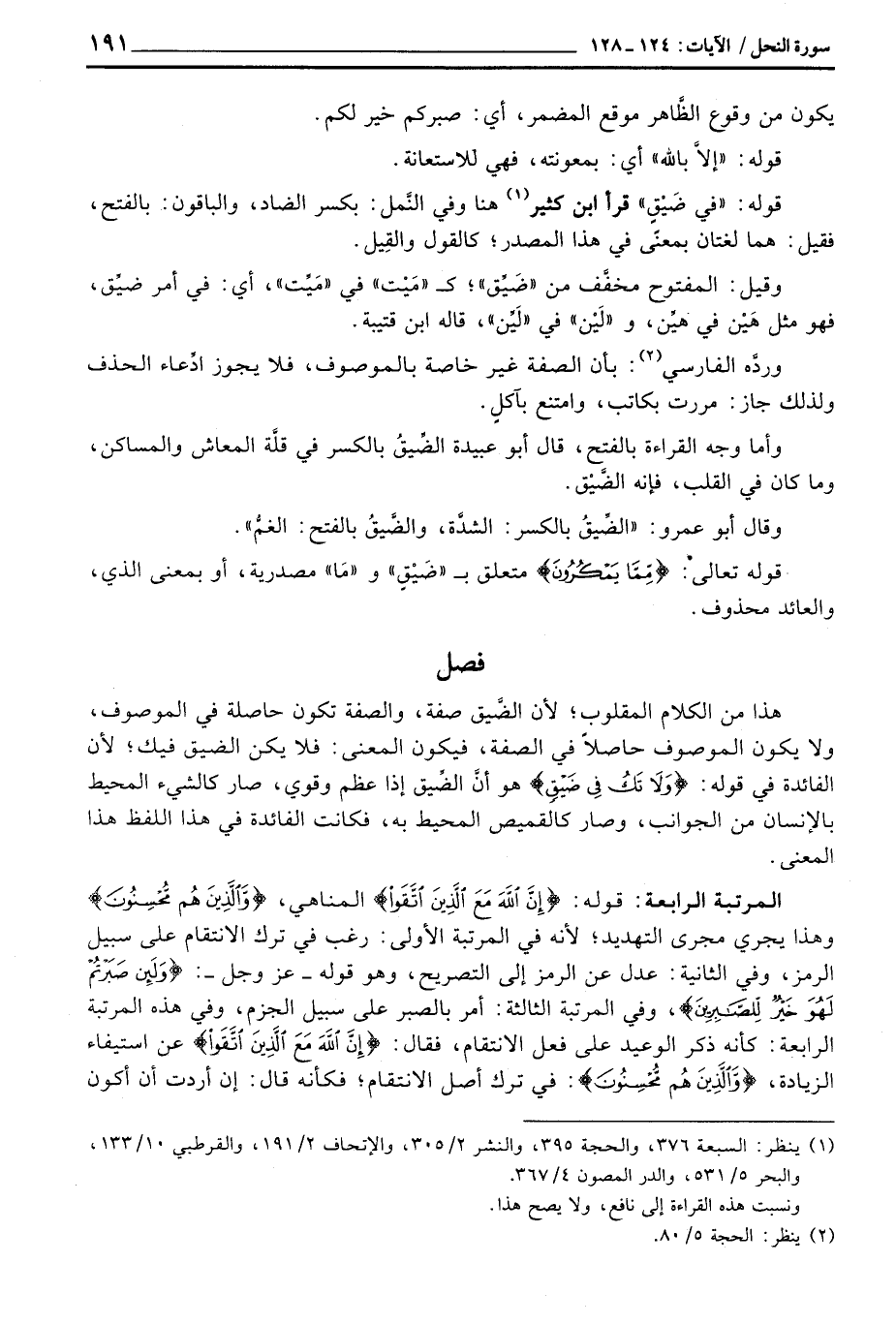 المرتبة الرابعة: قوله: {إِنَّ الله مَعَ الذين اتقوا} المناهي، {والذين هُم مُّحْسِنُونَ} وهذا يجري مجرى التهديد؛ لأنه في المرتبة الأولى: رغب في ترك الانتقام على سبيل الرمز، وفي الثانية: عدل عن الرمز إلى التصريح، وهو قوله - عَزَّ وَجَلَّ -: {وَلَئِن صَبَرْتُمْ لَهُوَ خَيْرٌ لِّلصَّابِرينَ} ، وفي المرتبة الثالثة: أمر بالصبر على سبيل الجزم، وفي هذه المرتبة الرابعة: كأنه ذكر الوعيد على فعل الانتقام، فقال: {إِنَّ الله مَعَ الذين اتقوا} عن استيفاء الزيادة، {والذين هُم مُّحْسِنُونَ} : في ترك أصل الانتقام؛ فكأنه قال: إن أردت أن أكون