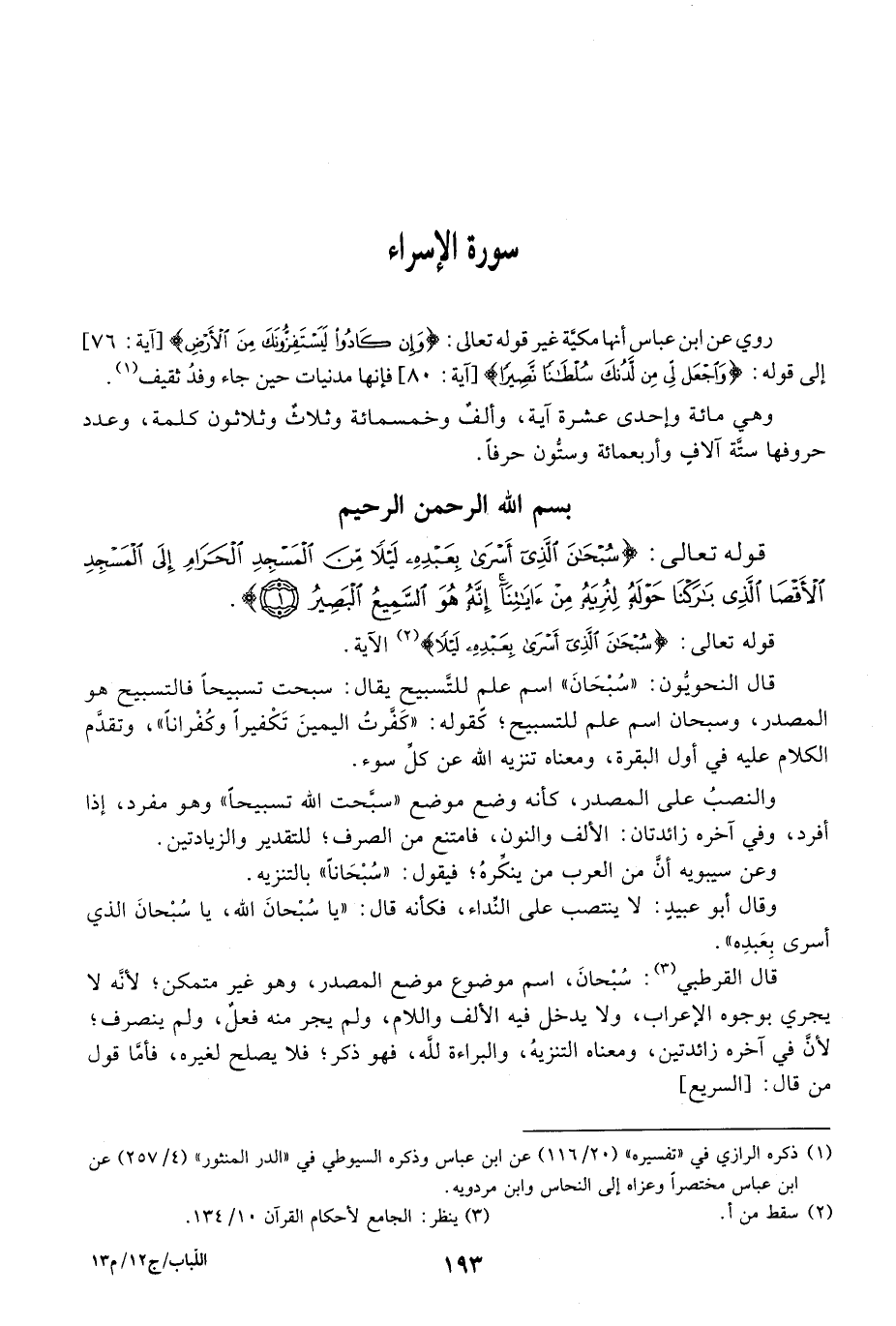 روي عن ابن عباس أنها مكية غير قوله تعالى: {وإن كانوا ليستفزونك من الأرض} [آية: 76] إلى قوله: {واجعل لي من لدنك سلطانا نصيرا} [آية: 80] فإنها مدنيات حين جاء وفد ثقيف. وهي مائة وإحدى عشرة آية، وألف وخمسمائة وثلاث وثلاثون كلمة، وعدد حروفها ستة آلاف وأربعمائة وستون حرفا. بسم الله الرحمن الرحيم قوله تعالى: {سُبْحَانَ الذي أسرى بِعَبْدِهِ لَيْلاً} الآية.