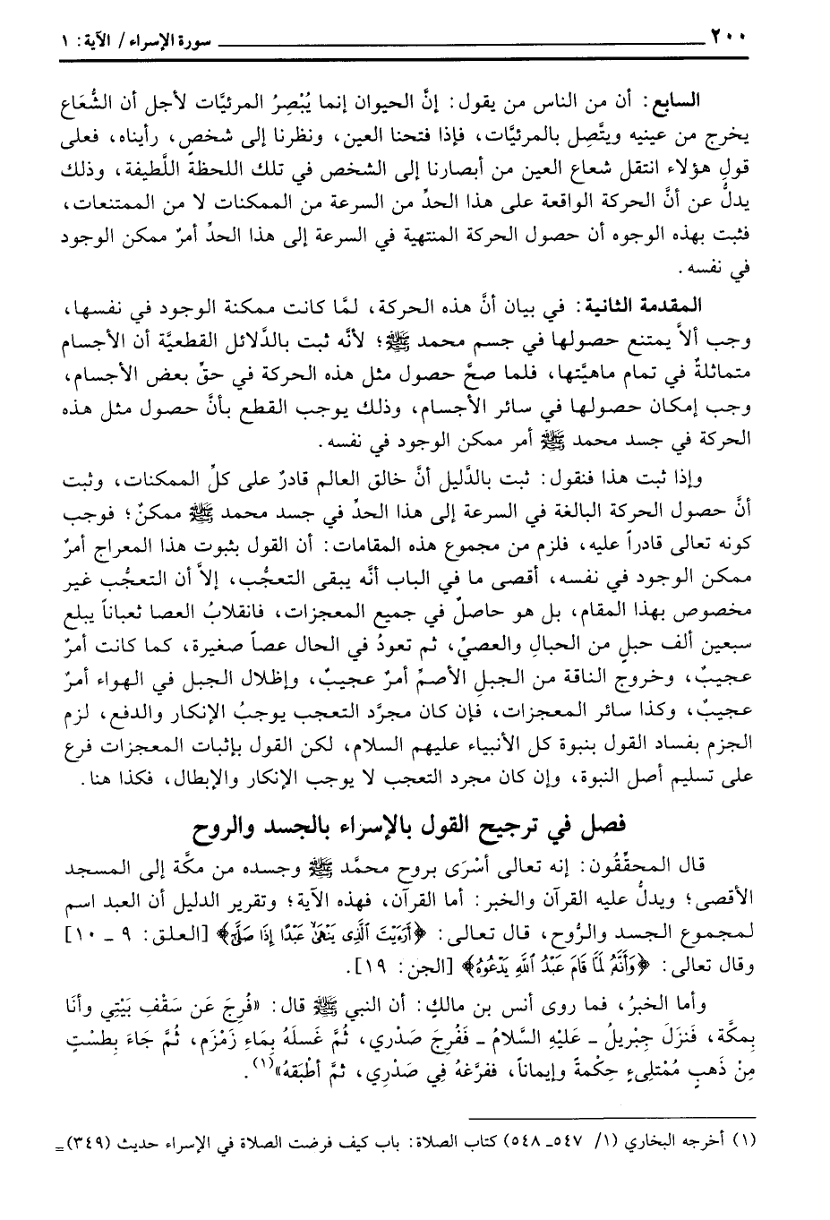 قال المحقِّقُون: إنه تعالى أسْرَى بروح محمَّد صَلَّى اللَّهُ عَلَيْهِ وَسَلَّم َ وجسده من مكَّة إلى المسجد الأقصى؛ ويدلُّ عليه القرآن والخبر: أما القرآن، فهذه الآية؛ وتقرير الدليل أن العبد اسم لمجموع الجسد والرُّوح، قال تعالى: