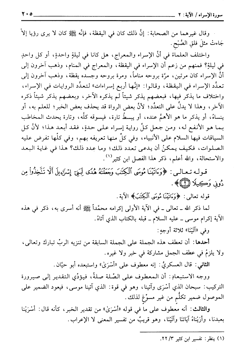 ووجه الاستبعادِ: أن المعطوف على الصِّلة صلةٌ، فيؤدِّي التقدير إلى صيرورة التركيب: سبحان الذي اسْرَى وآتينا، وهو في قوة: الذي آتينا موسى، فيعود الضمير على الموصول ضمير تكلُّمٍ من غير مسوِّغٍ لذلك.