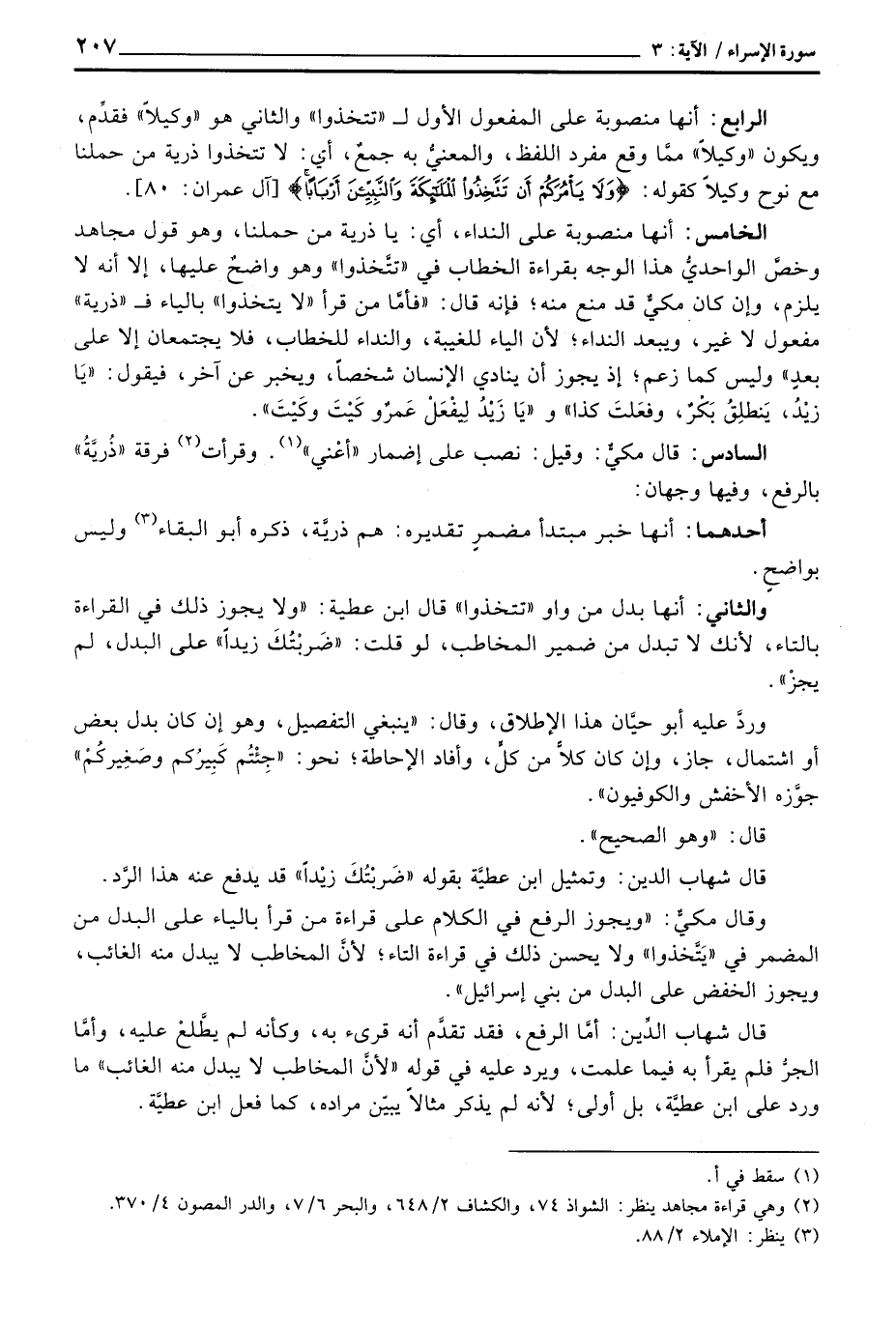 الرابع: أنها منصوبة على المفعول الأول ل «تتخذوا» والثاني هو «وكيلاً» فقدِّم، ويكون «وكيلاً» ممَّا وقع مفرد اللفظ، والمعنيُّ به جمعٌ، أي: لا تتخذوا ذرية من حملنا مع نوح وكيلاً كقوله: {وَلاَ يَأْمُرَكُمْ أَن تَتَّخِذُواْ الملائكة والنبيين أَرْبَاباً} [آل عمران: 80] .