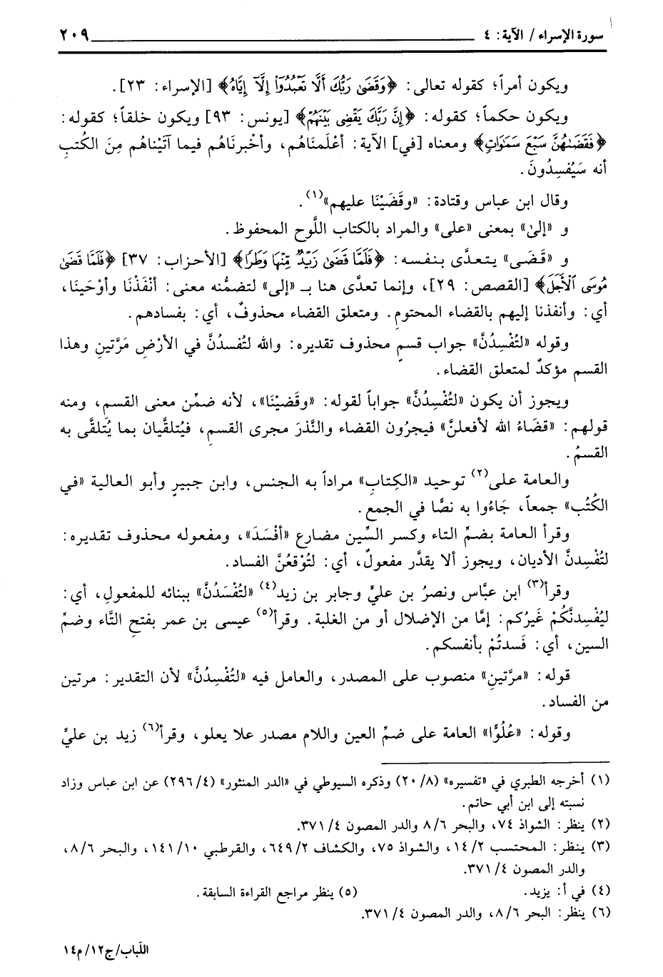 ويجوز أن يكون «لتُفْسِدُنَّ» جواباً لقوله: «وقَضيْنَا» ، لأنه ضمِّن معنى القسم، ومنه قولهم: «قضَاءُ الله لأفعلنَّ» فيجرُون القضاء والنَّذرَ مجرى القسمِ، فيُتلقَّيان بما يُتَلقَّى به القسمُ.