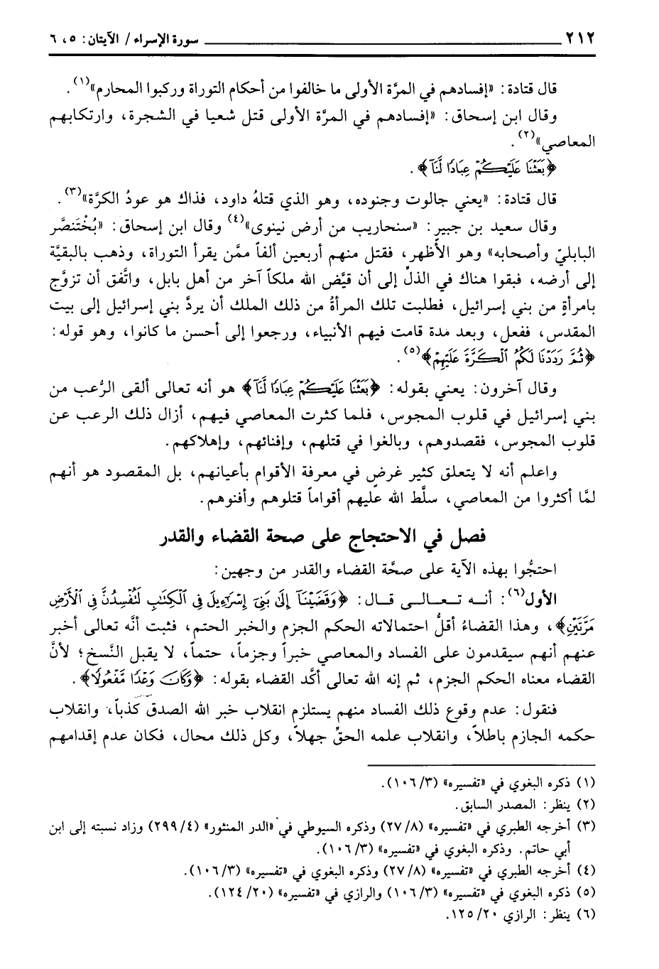 الأول: أنه تعالى قال: {وَقَضَيْنَآ إلى بَنِي إِسْرَائِيلَ فِي الكتاب لَتُفْسِدُنَّ فِي الأرض مَرَّتَيْنِ} ، وهذا القضاءُ أقلُّ احتمالاته الحكم الجزم والخبر الحتم، فثبت أنَّه تعالى أخبر عنهم أنهم سيقدمون على الفساد والمعاصي خبراً وجزماً، حتماً، لا يقبل النَّسخ؛ لأنَّ القضاء معناه الحكم الجزم، ثم إنه الله تعالى أكَّد القضاء بقوله: {وَكَانَ وَعْداً مَّفْعُولاً} .