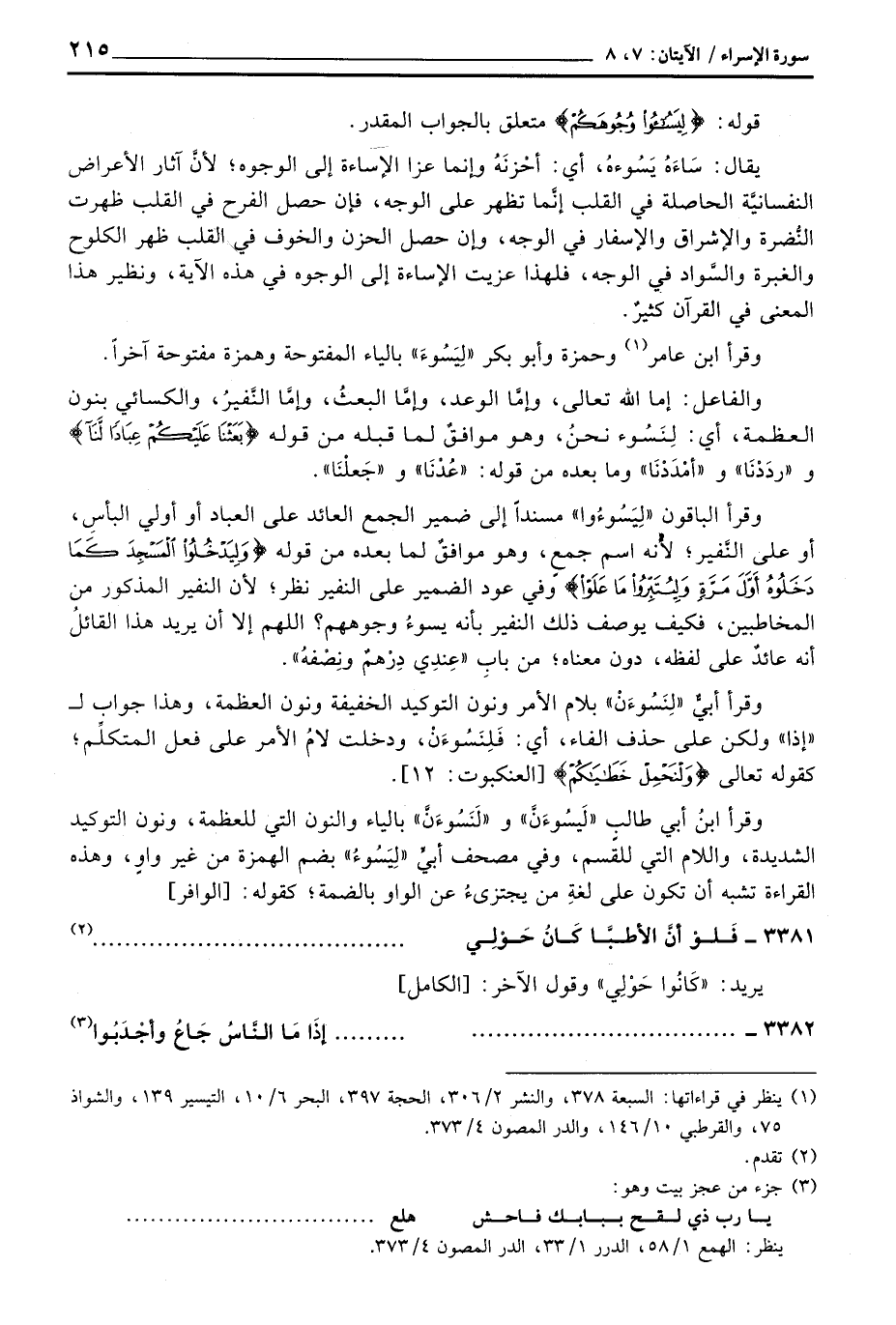 وقرأ الباقون «لِيَسًوءُوا» مسنداً إلى ضمير الجمع العائد على العباد أو أولي البأسِ، أو على النَّفير؛ لأنه اسم جمعٍ، وهو موافقٌ لما بعده من قوله {وَلِيَدْخُلُواْ المسجد كَمَا دَخَلُوهُ أَوَّلَ مَرَّةٍ وَلِيُتَبِّرُواْ مَا عَلَوْاْ} وفي عود الضمير على النفير نظر؛ لأن النفير المذكور من المخاطبين، فكيف يوصف ذلك النفير بأنه يسوءُ وجوههم؟ اللهم إلا أن يريد هذا القائلُ أنه عائدٌ على لفظه، دون معناه؛ من بابِ «عِندِي دِرْهمٌ ونِصْفهُ» .