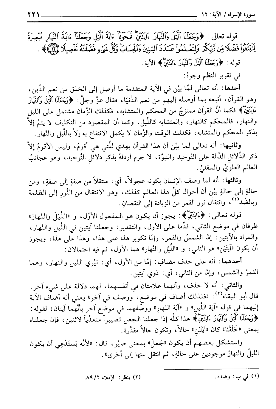 قوله تعالى: {آيَتَيْنِ} : يجوز أن يكون هو المفعول الأوَّل، و «اللَّيْلَ والنَّهارَ» ظرفان في موضع الثاني، قدِّما على الأول، والتقدير: وجعلنا آيتين في اللَّيل والنَّهار، والمراد بالآيتين: إمَّا الشمسُ والقمر، وإمَّا تكوير هذا على هذا، وهذا على هذا، ويجوز أن يكون «آيَتَيْن» هو الثاني، و «اللَّيل والنَّهار» هما الأول، ثم فيه احتمالان: