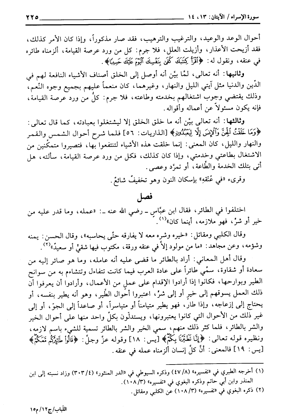 وقال أهل المعاني: أراد بالطائر ما قضى عليه أنه عامله، وما هو صائر إليه من سعادة أو شقاوة، سمِّي طائراً على عادة العرب فيما كانت تتفاءل وتتشاءم به من سوانح الطير وبوارحها، فكانوا غذا أرادوا الإقدام على عملٍ من الأعمال، وأرادوا أن يعرفوا أن ذلك العمل يسوقهم إلى خيرٍ أو إلى شرٍّ، اعتبروا أحوال الطَّير، وهو أنه يطير بنفسه، أو يحتاج إلى إزعاجه، وإذا طار، فهو يطير متيامناً أو متياسراً، أو صاعداً إلى الجوّ، أإلى غير ذلك من الأحوال التي كانوا يعتبرونها، ويستدلّون بكل واحد منها على أحوال الخير والشر بالطائر، فلما كثر ذلك منهم، سمي الخير والشر بالطائر تسمية للشيء باسم لازمه، ونظيره قوله تعالى: {إِنَّا تَطَيَّرْنَا بِكُمْ} [يس: 18] وقوله عزَّ وجلَّ: {قَالُواْ طَائِرُكُم مَّعَكُمْ} [يس: 19] فالمعنى: أنَّ كلَّ إنسان ألزمناه عمله في عنقه.