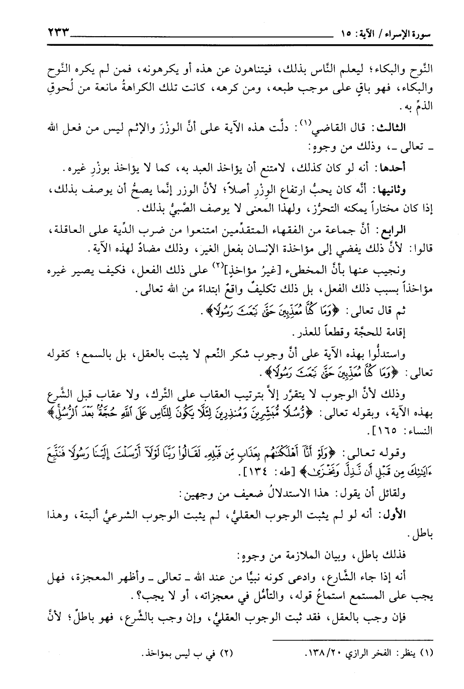 وذلك لأنَّ الوجوب لا يتقرَّر إلاَّ بترتيب العقاب على التَّرك، ولا عقاب قبل الشَّرع بهذه الآية، وبقوله تعالى: {رُّسُلاً مُّبَشِّرِينَ وَمُنذِرِينَ لِئَلاَّ يَكُونَ لِلنَّاسِ عَلَى الله حُجَّةٌ بَعْدَ الرسل} [النساء: 165] .