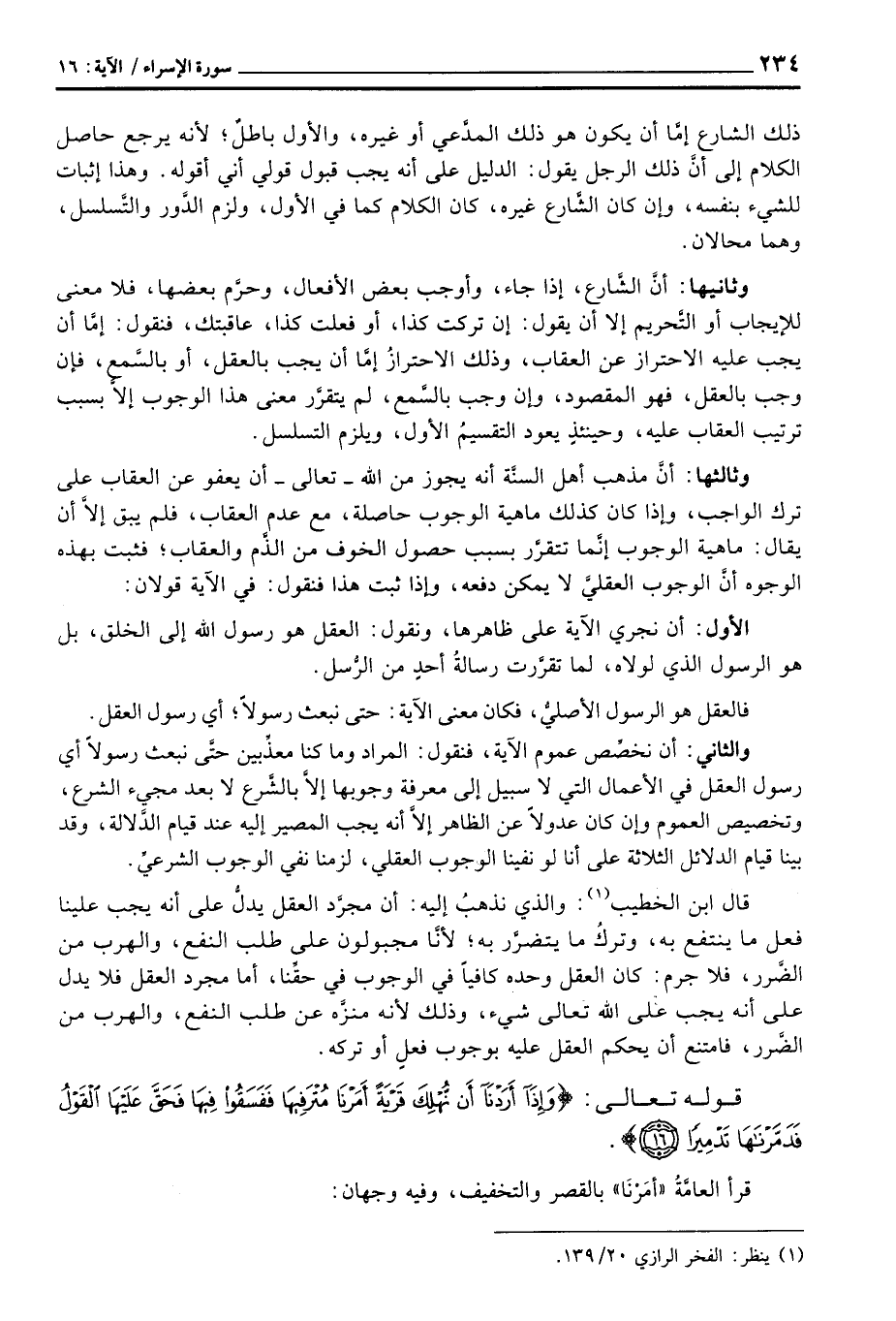 وثالثها: أنَّ مذهب أهل السنَّة أنه يجوز من الله - تعالى - أن يعفو عن العقاب على ترك الواجب، وإذا كان كذلك ماهية الوجوب حاصلة، مع عدم العقاب، فلم يبق إلاَّ أن يقال: ماهية الوجوب إنَّما تتقرَّر بسبب حصول الخوف من الذَّم والعاقب؛ فثبت بهذه الوجوه أنَّ الوجوب العقلي لا يمكن دفعه، وإذا ثبت هذا فنقول: في الآية قولان: