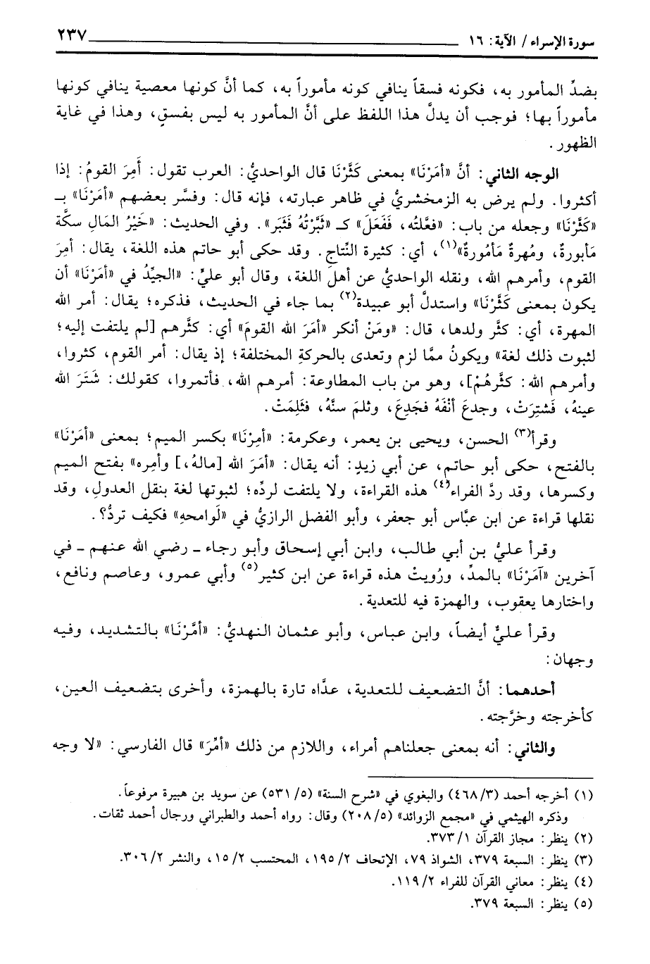 الوجه الثاني: أنَّ» أمَرْنَا «بمعنى كَثَّرْنَا قال الواحديُّ: العرب تقول: أَمِرَ القومُ: إذا أكثروا. ولم يرض به الزمخشريُّ في ظاهر عبارته، فإنه قال: وفسَّر بعضهم» أمَرْنَا «ب» كَثَّرْنَا «وجعله من باب:» فعَّلتُه، فَفَعَلَ «ك» ثَبَّرْتُهُ فَثَبَر «. وفي الحديث:» خَيْرُ المَالِ سكَّة مَأبورةٌ، ومُهرةٌ مَأمُورةٌ «، أي: كثيرة النِّتاجِ. وقد حكى أبو حاتم هذه اللغة، يقال: أمِرَ القوم، وأمرهم الله، ونقله الواحديُّ عن أهل اللغة، وقال أبو عليٍّ:» الجيِّدُ في «أمَرْنَا» أن يكون بمعنى «كَثَّرْنَا» واستدلَّ أبو عبيدة بما جاء في الحديث، فذكره؛ يقال: أمر الله المهرة، أي: كثَّر ولدها، قال: «ومَنْ أنكر» أمَرَ الله القومَ «أي: كثَّرهم [لم يلتفت إليه؛ لثبوت ذلك لغة» ويكونُ ممَّا لزم وتعدى بالحركةِ المختلفة؛ إذ يقال: أمر القوم، كثروا، وأمرهم الله: كثَّرهُمْ] ، وهو من باب المطاوعة: أمرهم الله، فأتمروا، كقولك: شَتَرَ اله عينهُ، فَشتِرَتْ، وجدعَ أنْفَهُ فجَدِعَ، وثلمَ سنَّهُ، فثَلِمَتْ.
