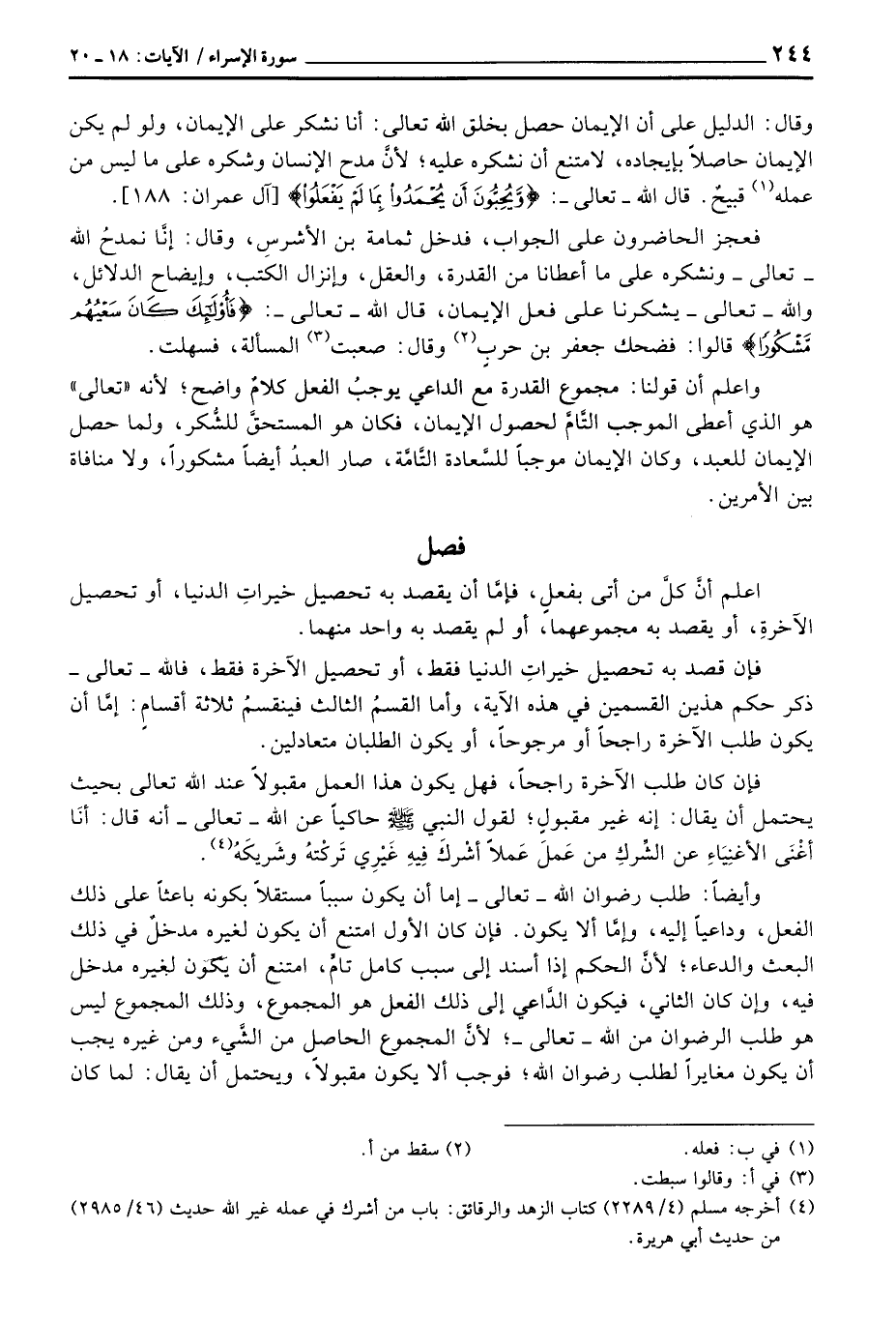 فإن قصد به تحصيل خيراتِ الدنيا فقط، أو تحصيل الآخرة فقط، فالله - تعالى - ذكر حكم هذين القسمين في هذه الآية، وأما القسمُ الثالث فينقسمُ ثلاثة أقسامٍ: إمَّا أن يكون طلب الآخرة راجحاً أو مرجوحاً، أو يكون الطلبان متعادلين.